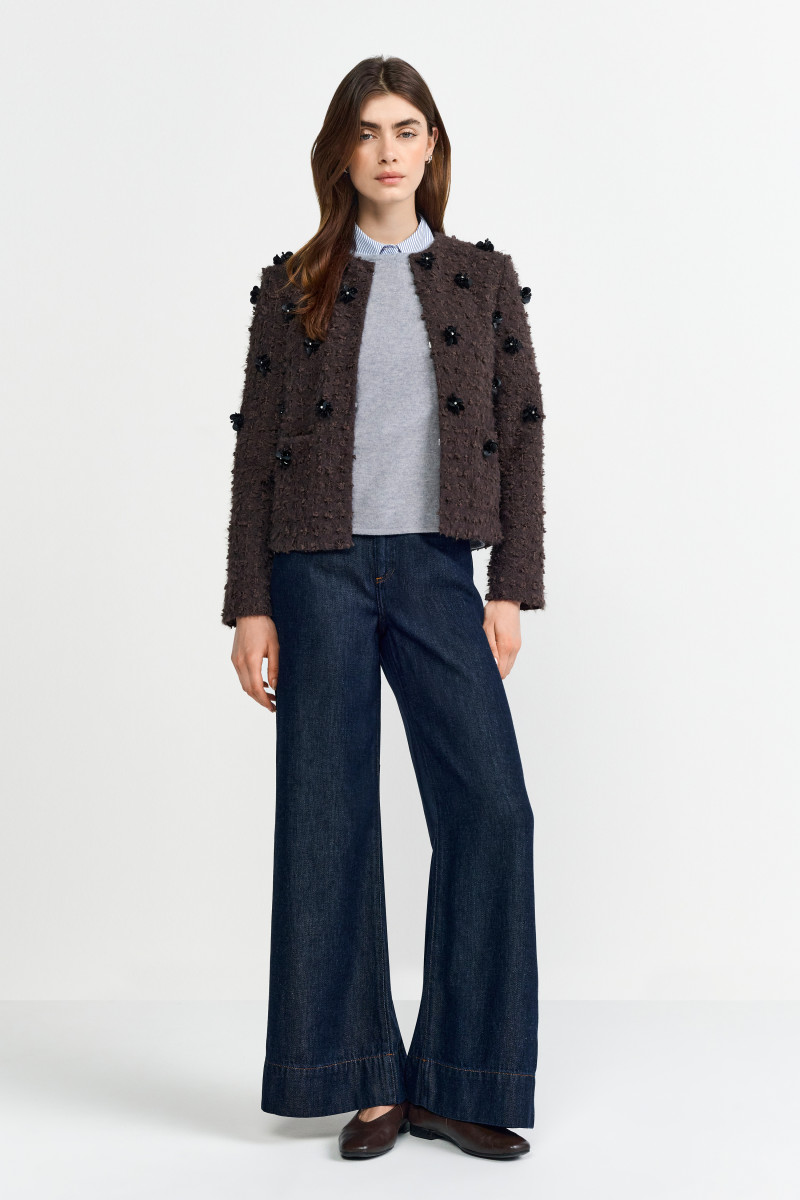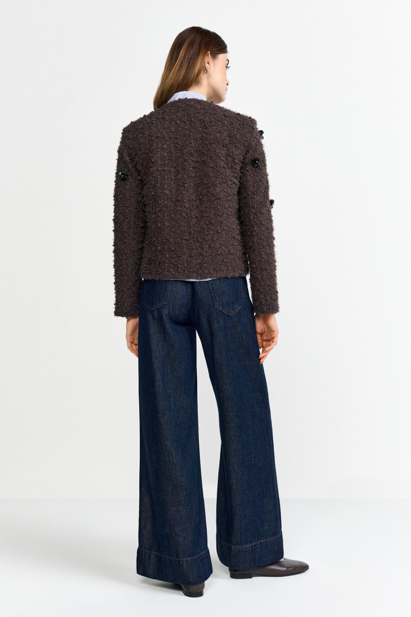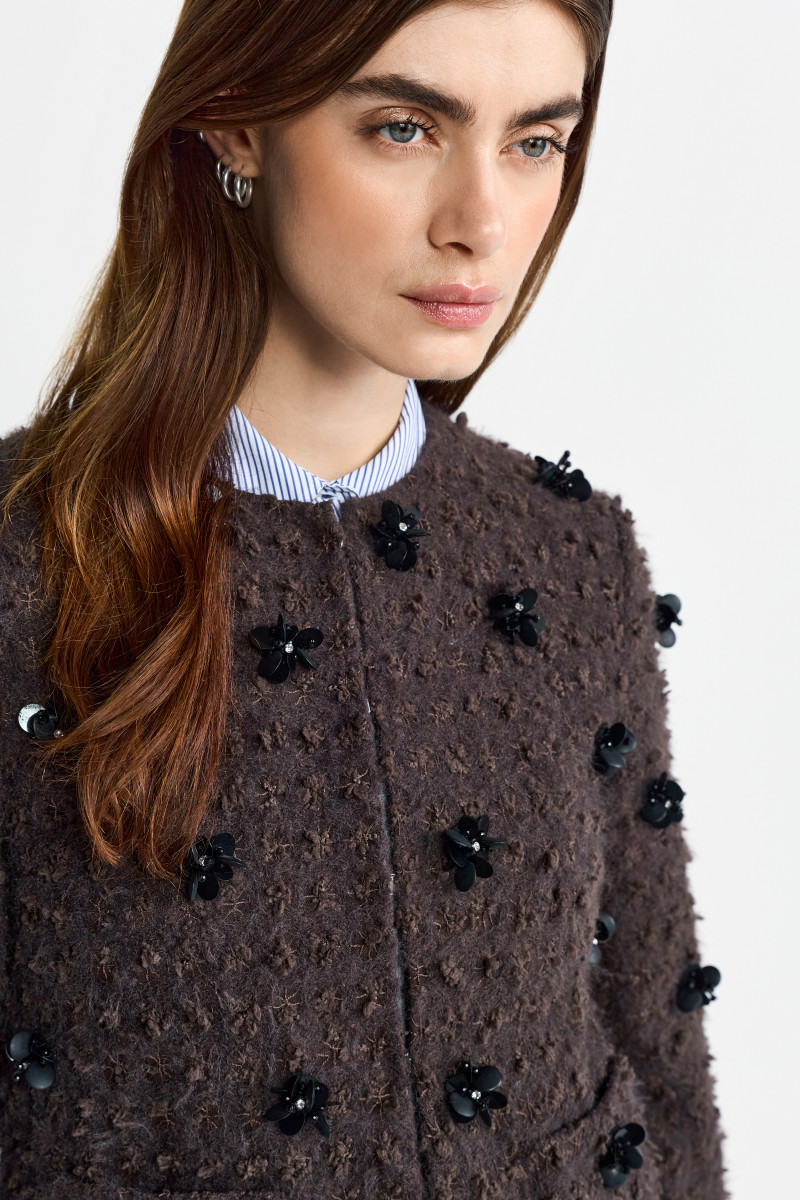 Diese edle Bouclé-Jacke vereint raffinierten Stil mit verspielten Details. Der charakteristische Bouclé-Stoff in dunkelbraun gibt der Jacke eine luxuriöse Textur, während die schwarzen Blumenapplikationen auf der Oberfläche der Jacke für einen modernen und einzigartigen Akzent sorgen. Die glänzenden, schwarzen Blüten verleihen dem Design eine elegante, aber dennoch unkonventionelle Note, die sowohl im Alltag als auch zu besonderen Anlässen zum Hingucker wird.
