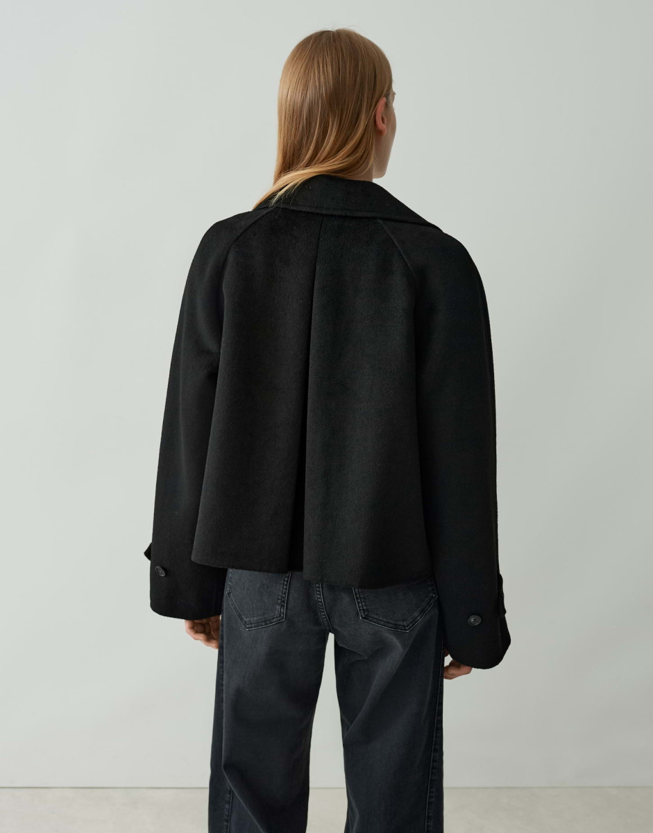 Lockere Passform | Leicht ausgestellt geschnitten | Verkürzte Länge | Langarm | Reverskragen | weicher Griff | Wärmender Stoff | Paspeltaschen vorne | Kellerfalte | Zweireihige Knopfleiste | Raglanärmel | Riegel an der Manschette | Knöpfe in Horn Optik