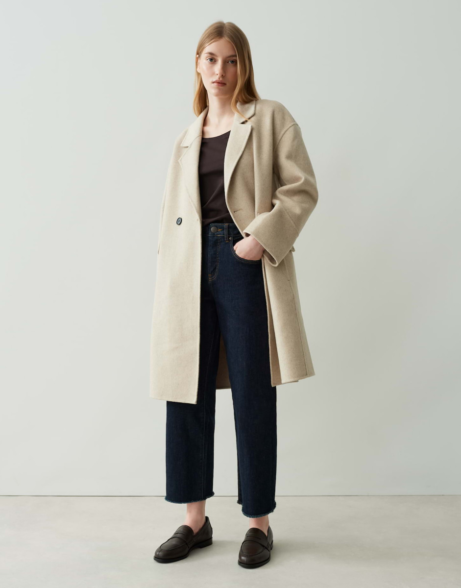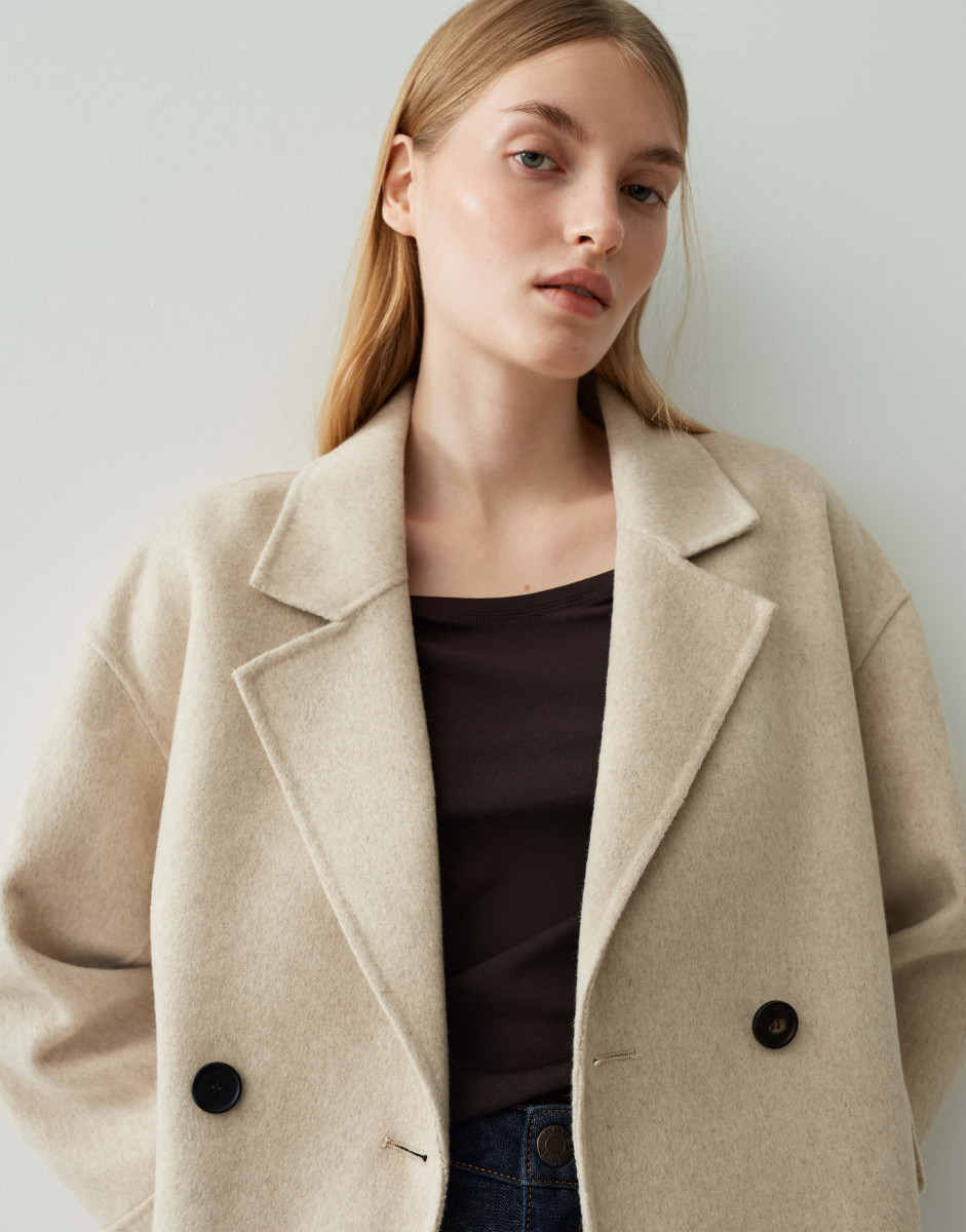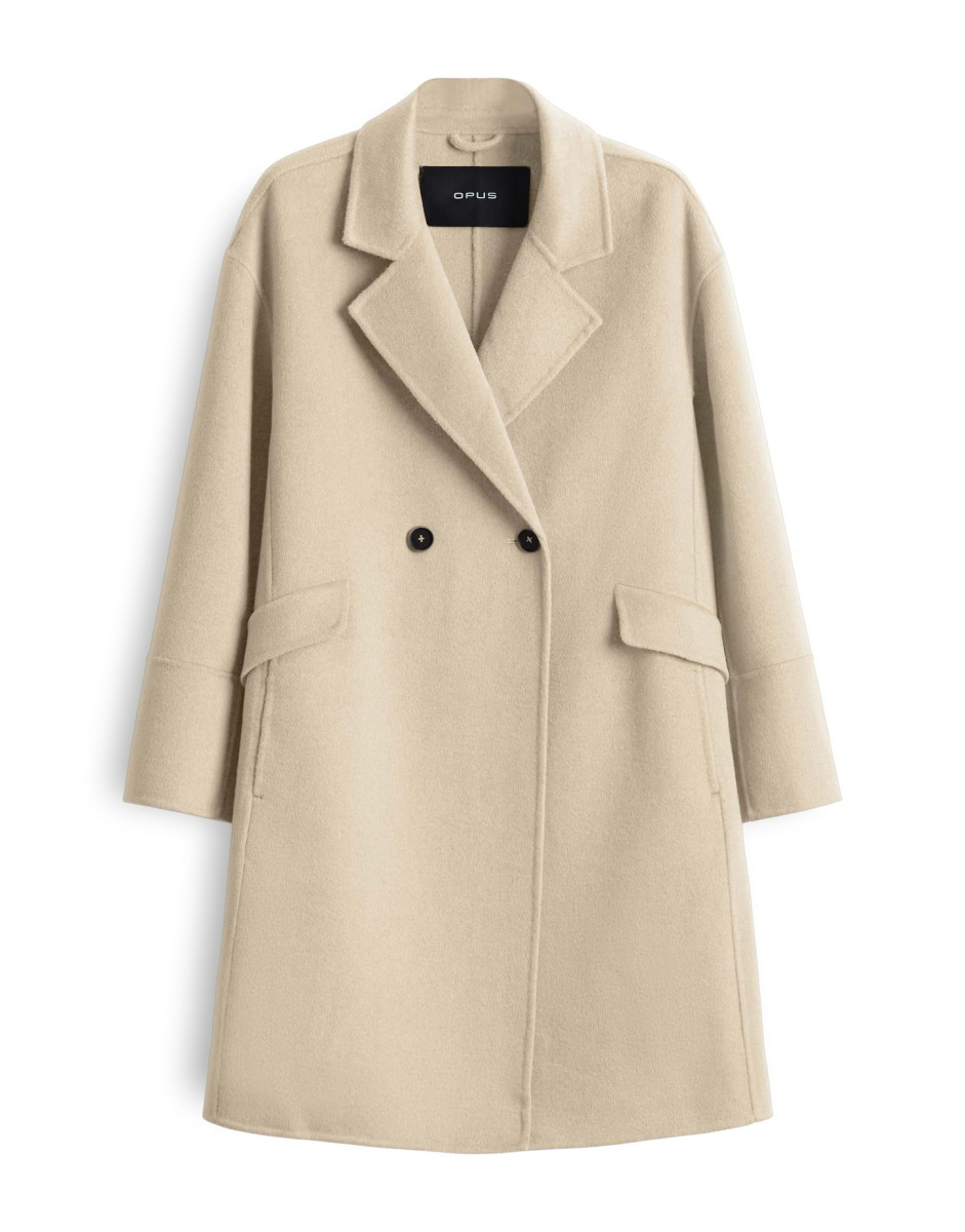 Normale Passform, gerader Schnitt | Überschnittene Schulter | Langarm | Reverskragen | Webware | Weicher Griff | Wärmender Stoff | Eingrifftaschen | Zier-Pattentaschen vorne | Zweireihige Knopfleiste | Knöpfe in Horn Optik | Längsnaht hinten