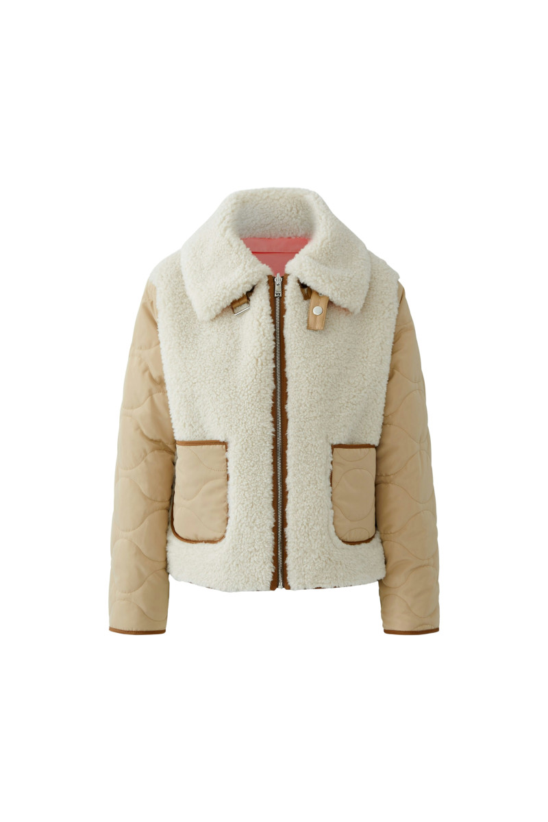 Materialmix von wattiertem, gestepptem Nylon, Kunstfell und weichem Lederimitat Gerade geschnitten, reguläre Länge Kuscheliger, abknöpfbarer Kragen mit extra Riegel für kalte Temperaturen Durchgehender Metallreißverschluss Innen und außen je zwei aufgesetzte Taschen * Länge bei Größe 36: 64cm