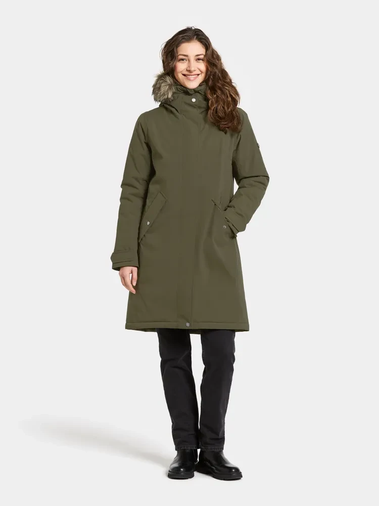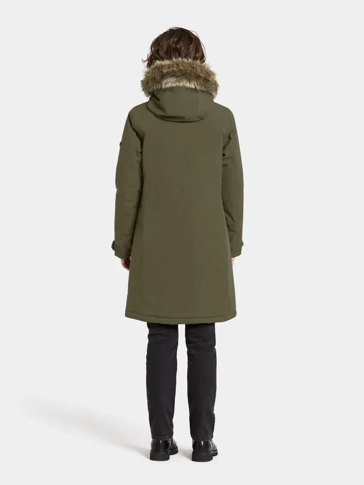 Erna ist ein warmer Parka mit femininer Passform, perfekt für den täglichen Gebrauch. Er ist wasser- und winddicht mit versiegelten Nähten und aus einem atmungsaktiven Material gefertigt, was ihn ideal für alle Wetterbedingungen macht. Der Parka verfügt über einen abnehmbaren Kunstpelz an der Kapuze und eine verstellbare Taille mit Kordelzug für eine individuelle Passform.