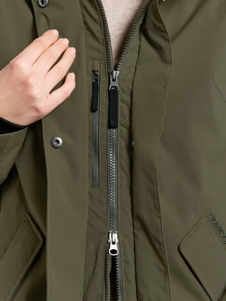 Er hat einen Zwei-Wege-Reißverschluss an der Vorderseite, der durch eine Knopfleiste geschützt ist, und der Reißverschluss liegt dank des Kragendesigns nie direkt am Kinn an. Die Seitentaschen schließen mit Knöpfen und die Manschetten sind mit Klettverschluss verstellbar und haben innen elastische Bündchen für zusätzlichen Komfort.