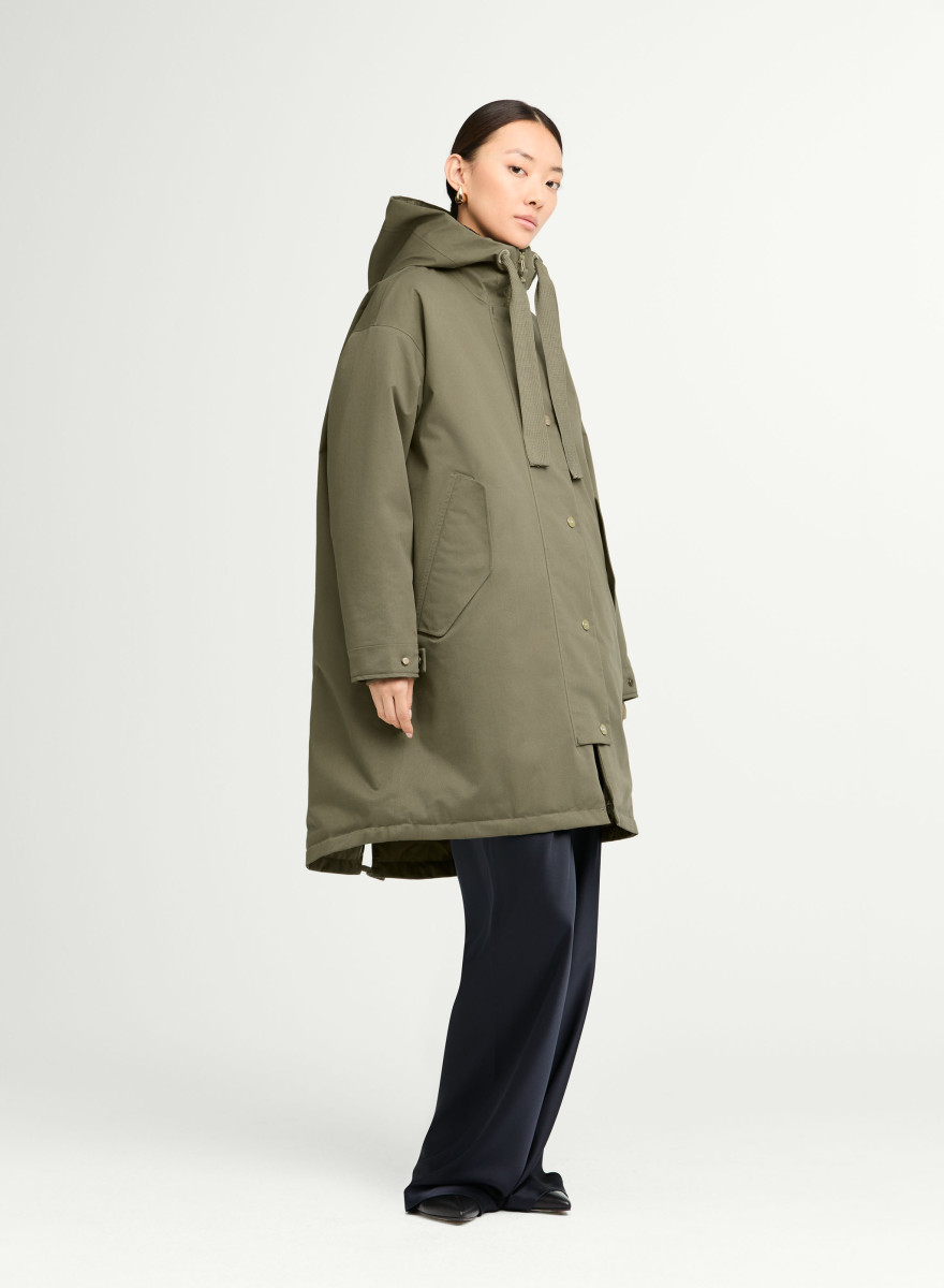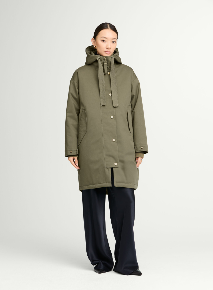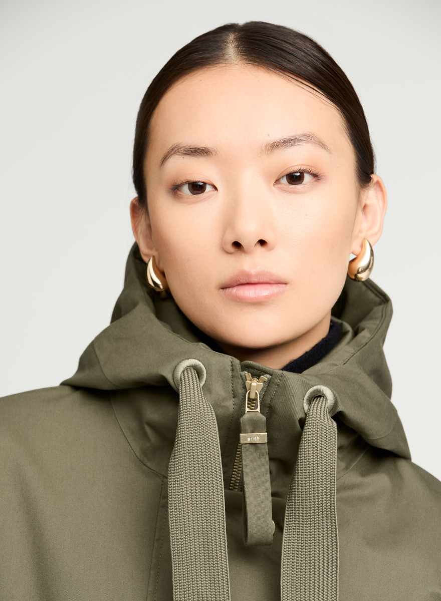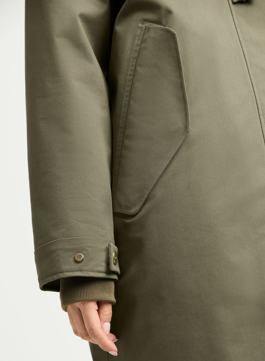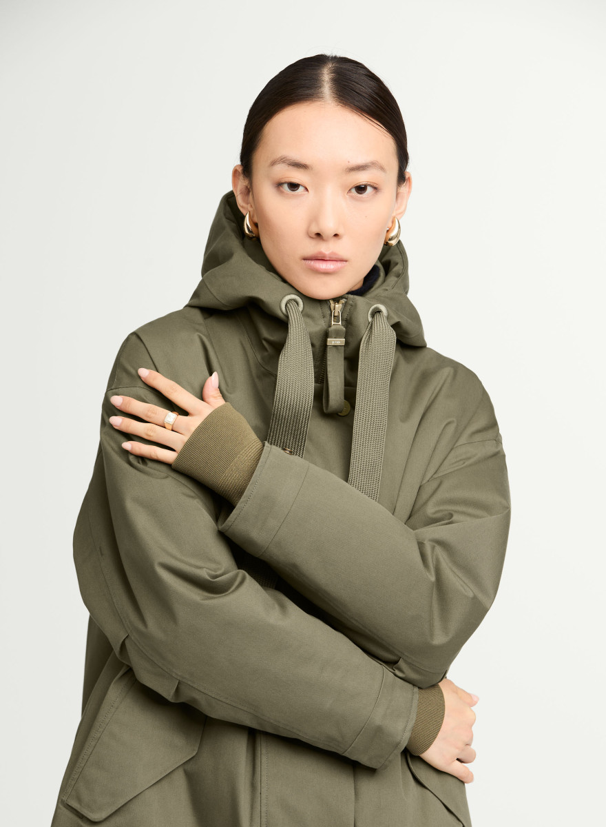 Dieser klassische Parka mit Fishtail überrascht mit einer femininen, opulent anmutenden Silhouette, die Volumen und Eleganz perfekt ausbalanciert. Gefertigt aus dem wetterfesten 'Eco Cotton Blend' mit sattem Griff und glattem, zeitlos-edlem Finish, schützt er zuverlässig vor Wind und Regen – stilvoll, souverän, kompromisslos funktional. Durchdachte Ausstattungsdetails wie die voll verstellbare Kapuze, ein verlängerter Saum im Rücken, fleecegefütterte Taschen und warme Strickbündchen an den Ärmeln sorgen für maximalen Komfort und Wärme in der kalten Jahreszeit – ohne dabei an modischer Leichtigkeit zu verlieren. Ein Parka, der Wetter trotzt und zugleich Stil zelebriert – für Winterlooks mit klarer Haltung.
