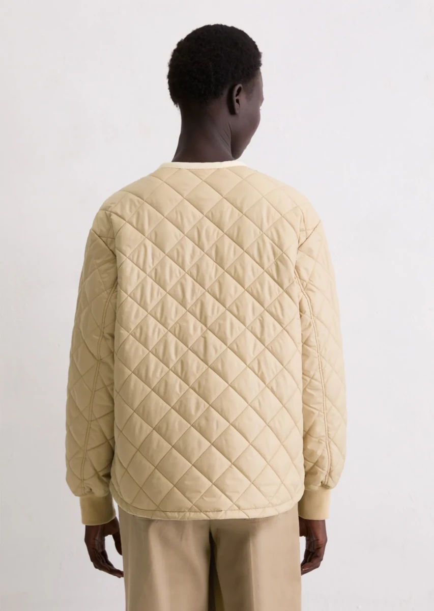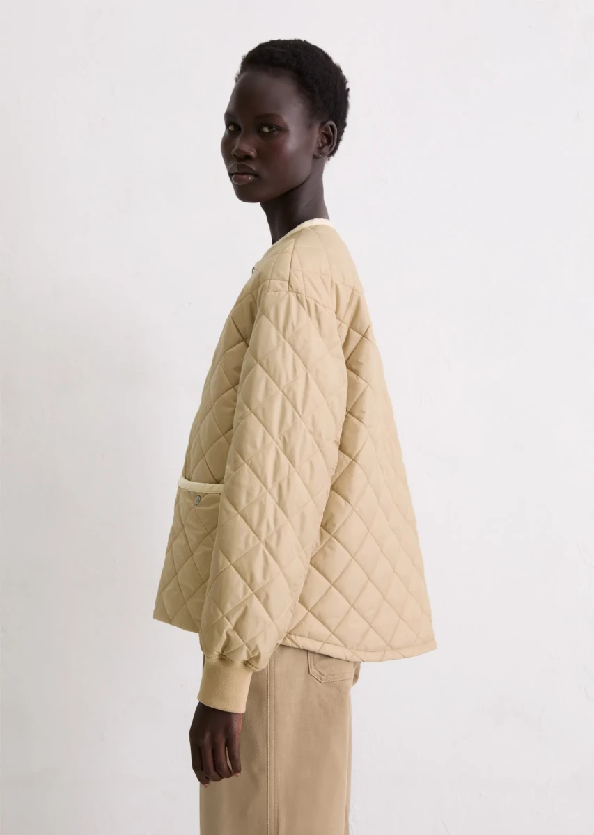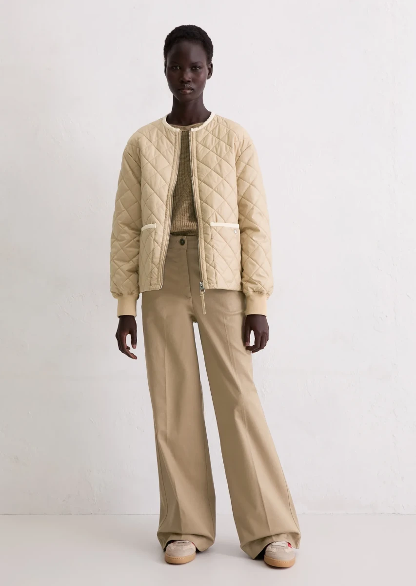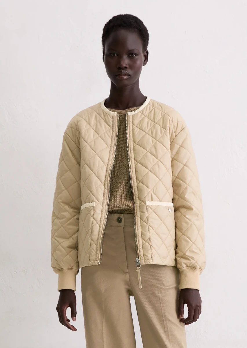 Was zieht man an, wenn es in der Übergangszeit ungemütlich wird, es regnet oder ein kalter Wind weht, man aber trotzdem nicht auf einen lässigen, unkomplizierten Stil verzichten möchte? Die leichte, kragenlose Steppjacke mit Wattierung ist das coolste Trendteil dieser Saison und schützt stilvoll vor allen Wetterkapriolen. Die locker geschnittene Jacke verfügt über überschnittene Schultern und einen leicht gerundeten Saum. Besonders auffällig sind die aufgesetzten Taschen mit Cord-Einfassung, der kernige Frontreißverschluss aus Metall, die langen Ärmel mit weichem Rippbündchen-Abschluss und die klassischen Steppnähte in Rautenform. Das Schöne daran ist, dass man die Jacke sowohl im Frühling als auch im Herbst tragen kann.