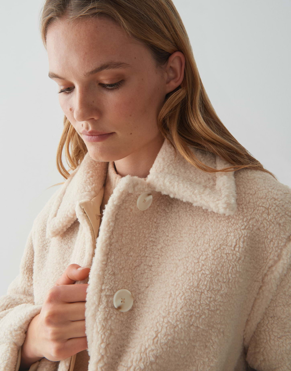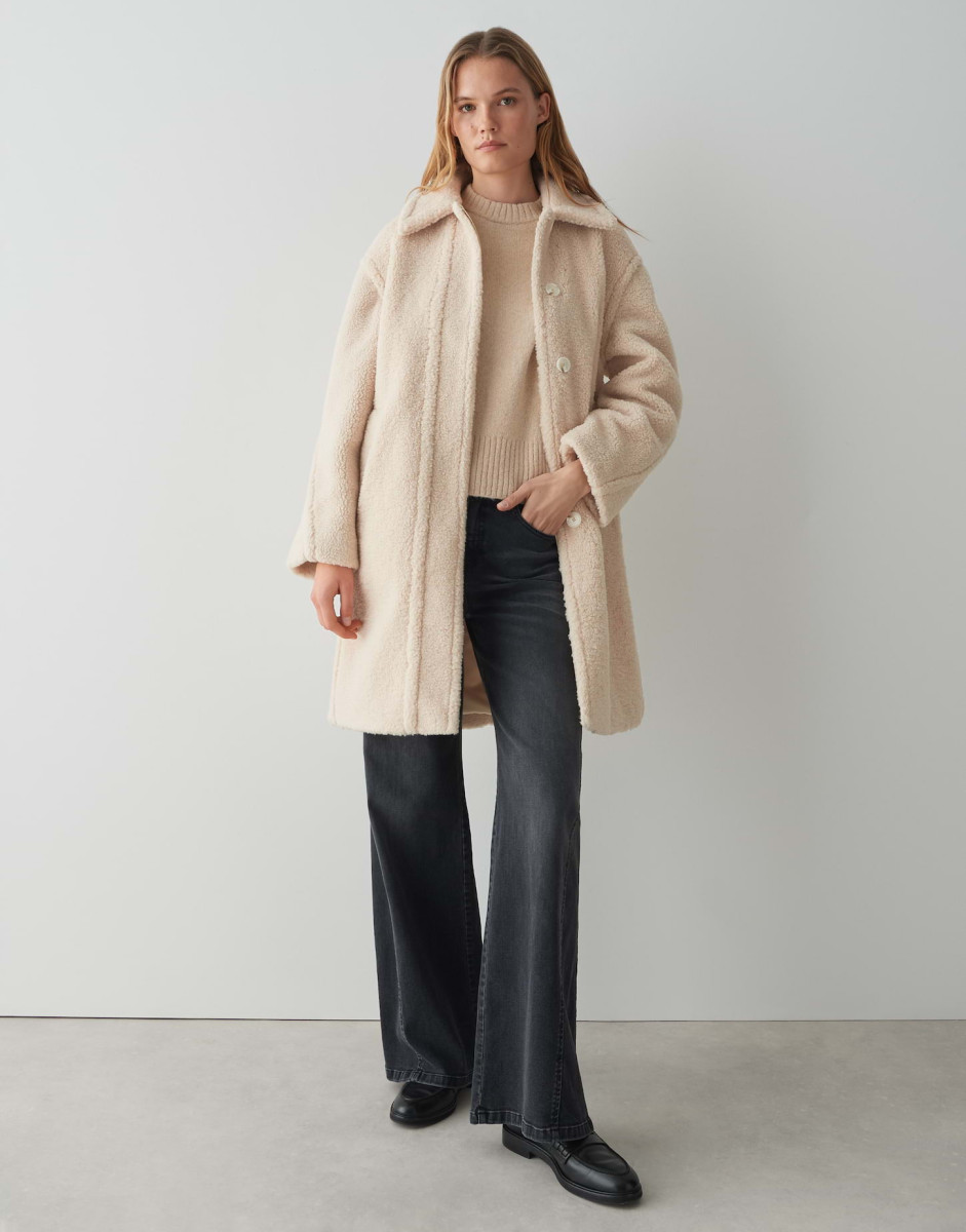 Lockere Passform | Ovaler Schnitt | Knielang | Überschnittene Schulter | Umlegekragen | Teddyfell | Glattes Innenfutter | Flauschiger Griff | Wärmend | Schräge Eingrifftaschen | Verdeckte Knopfleiste