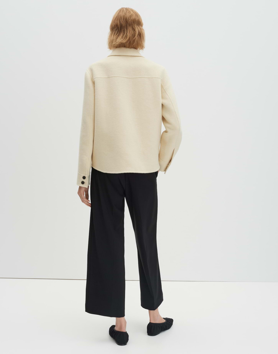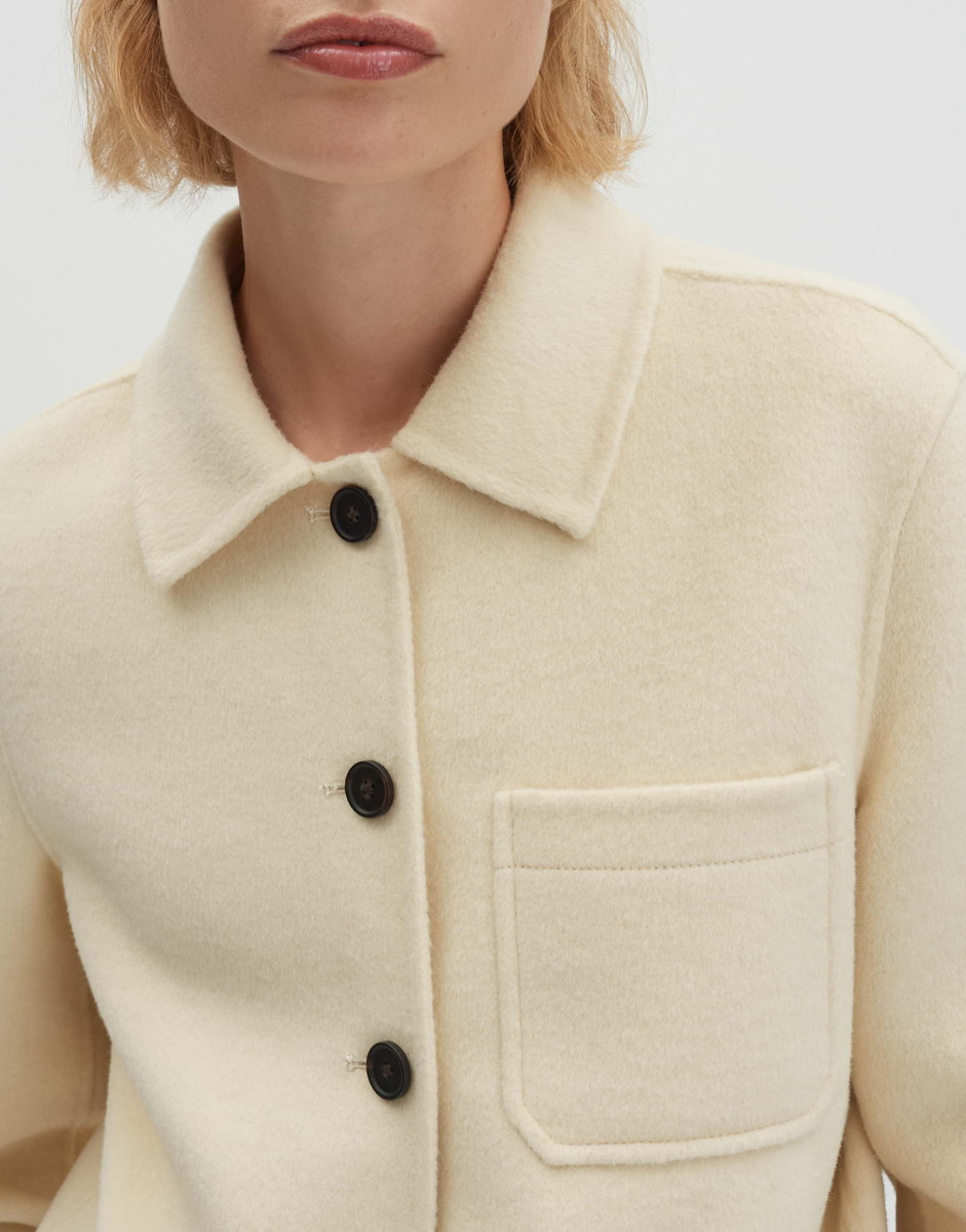 Lockere Passform | Überschnittene Schulter mit Langarm | Hemdblusenkragen | Wolle | Webware | Gekämmte Oberfläche | Weicher Griff | Formstabil | Aufgesetzte Taschen vorne | Knopfleiste vorn