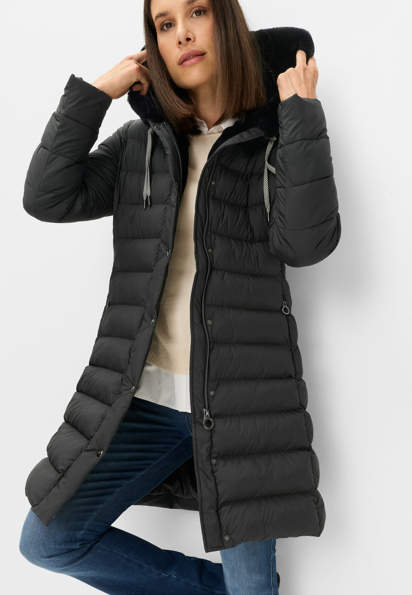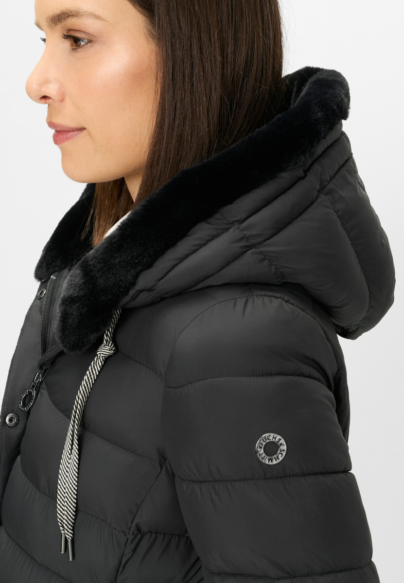 Ein besonderes Highlight ist die großzügige Kapuze, die innen mit einem weichen, flauschigen Kunstfell gefüttert ist – ideal für zusätzlichen Komfort und einen luxuriösen Look. Die Kapuze kann bei Bedarf eng gezogen werden, um vor Wind zu schützen.