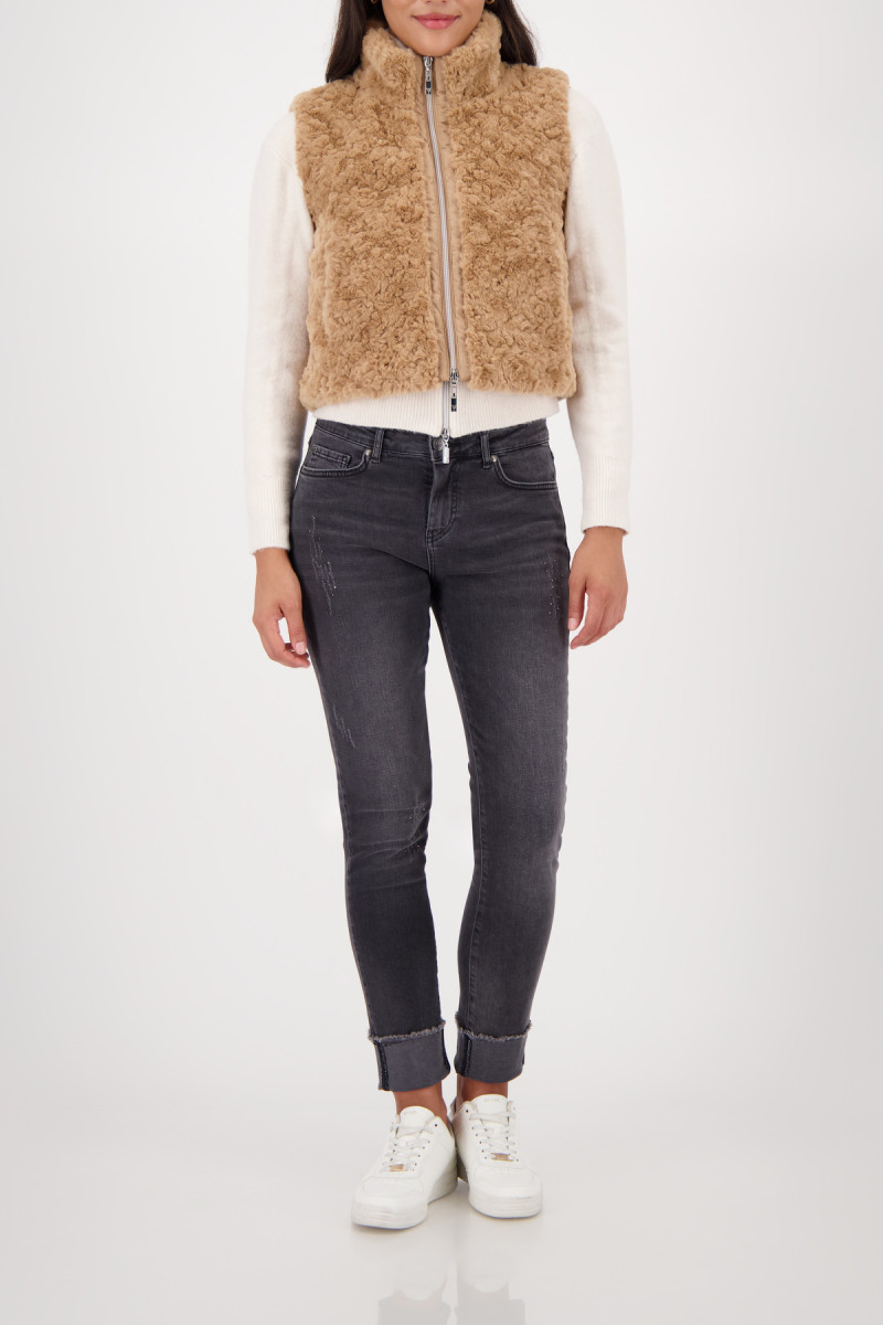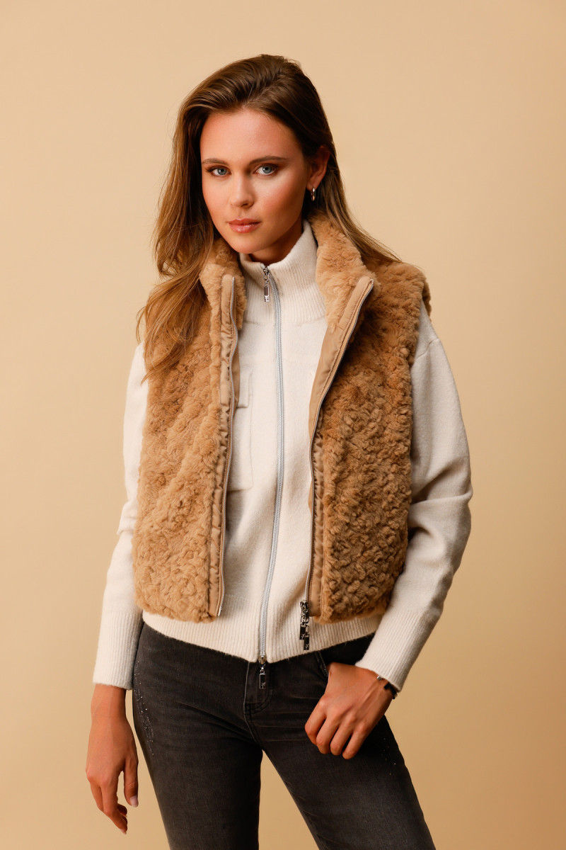 Die kuschelig weiche Weste aus Kunstfell begeistert mit einem Stehkragen und seitlichen Eingrifftaschen.