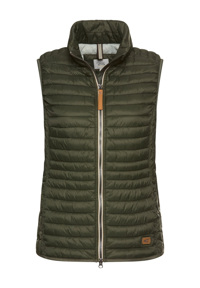 Die leichte Steppweste aus recyceltem Polyamid vereint Nachhaltigkeit und Funktionalität. Sie ist wasserabweisend, winddicht und daunenfrei wattiert, was sie zu einem idealen Begleiter für verschiedene Wetterlagen macht. Der praktische 2-Wege-Reißverschluss ermöglicht das Öffnen der Front sowohl von oben als auch von unten. Zwei Einstecktaschen sind seitlich eingearbeitet. Ein kleines camel active Logo befindet sich auf der Rückseite sowie ein camel active Badge über dem Saum.