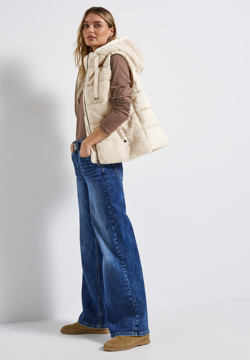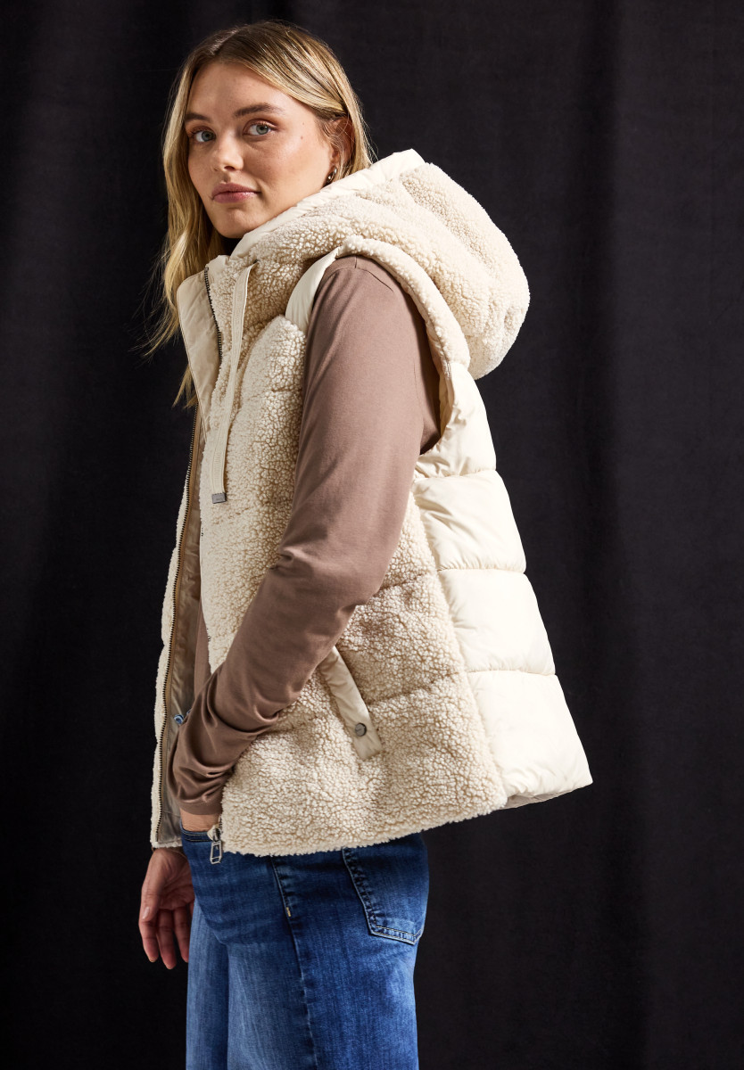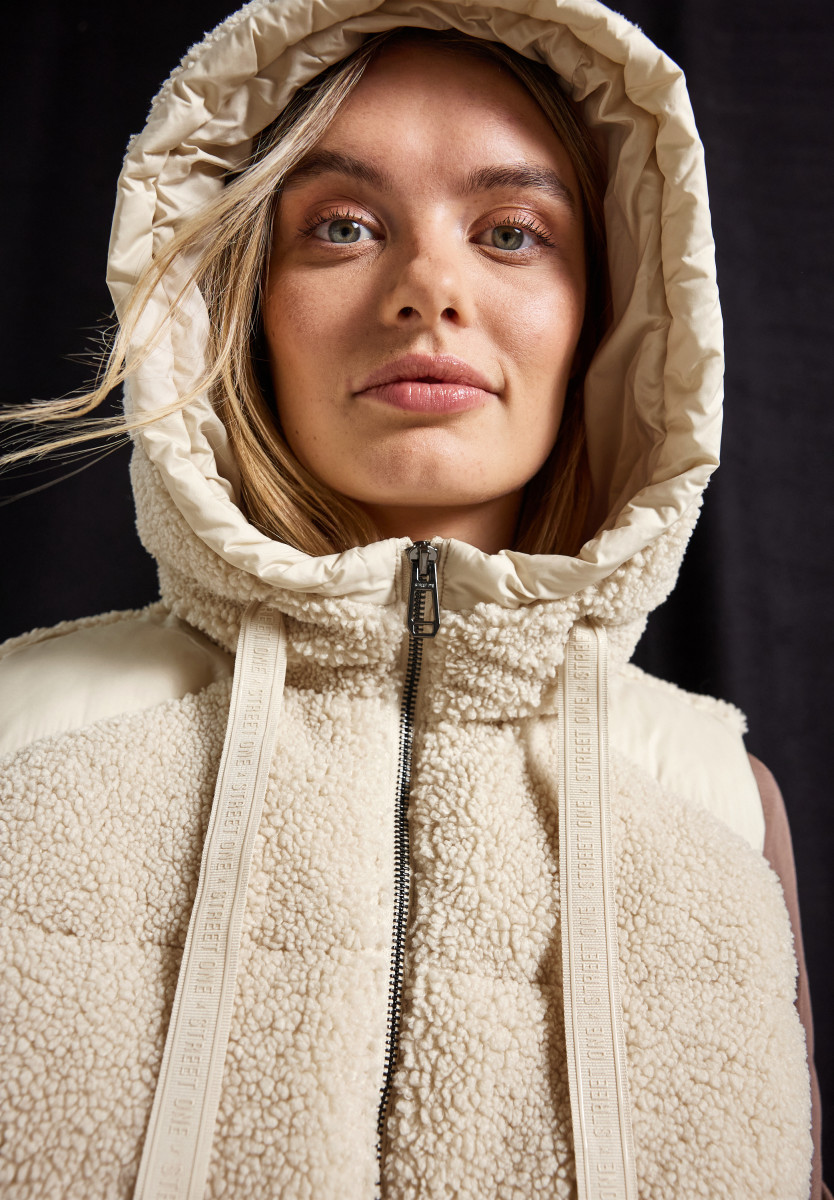 Die Teddy-Weste von Street One für Damen vereint kuschelige Wärme mit sportivem Materialmix. Softshell-Details und eine Kapuze mit Tunnelzug ergänzen die softe Teddy-Qualität perfekt und sorgen für einen modernen Look. Seitliche Taschen machen die Weste zum idealen Begleiter für lässige Layering-Outfits.