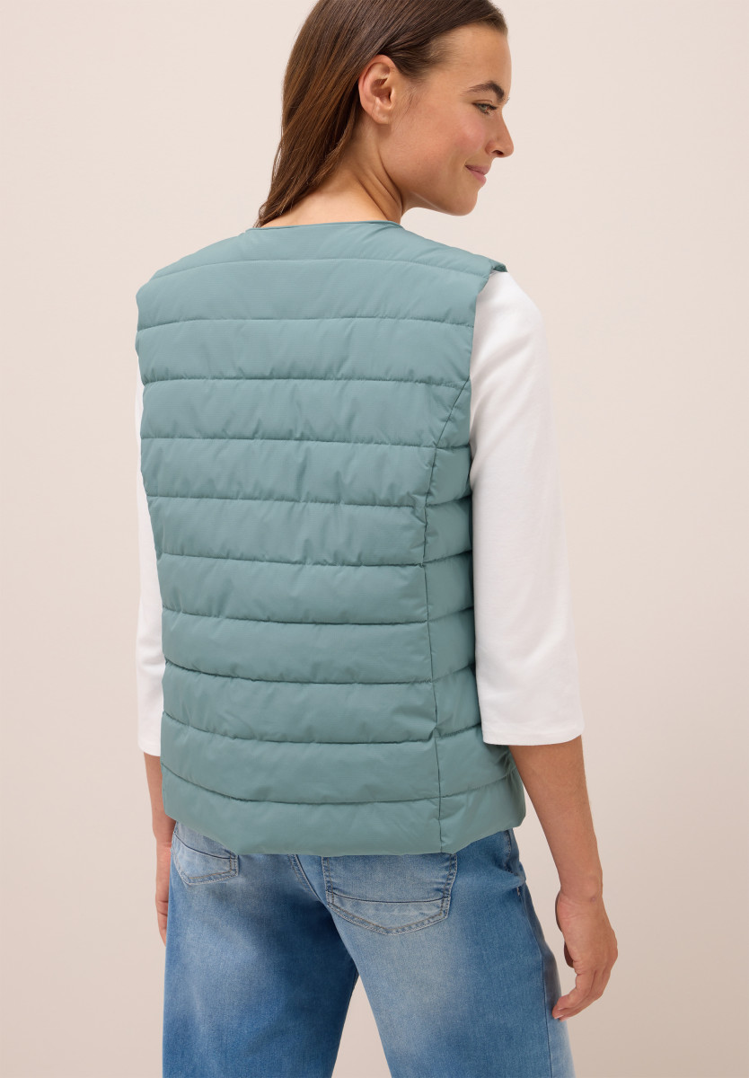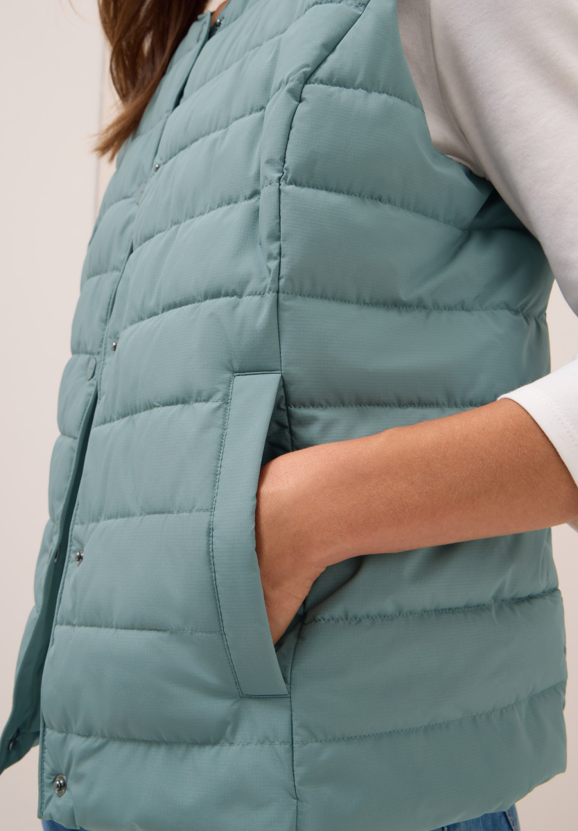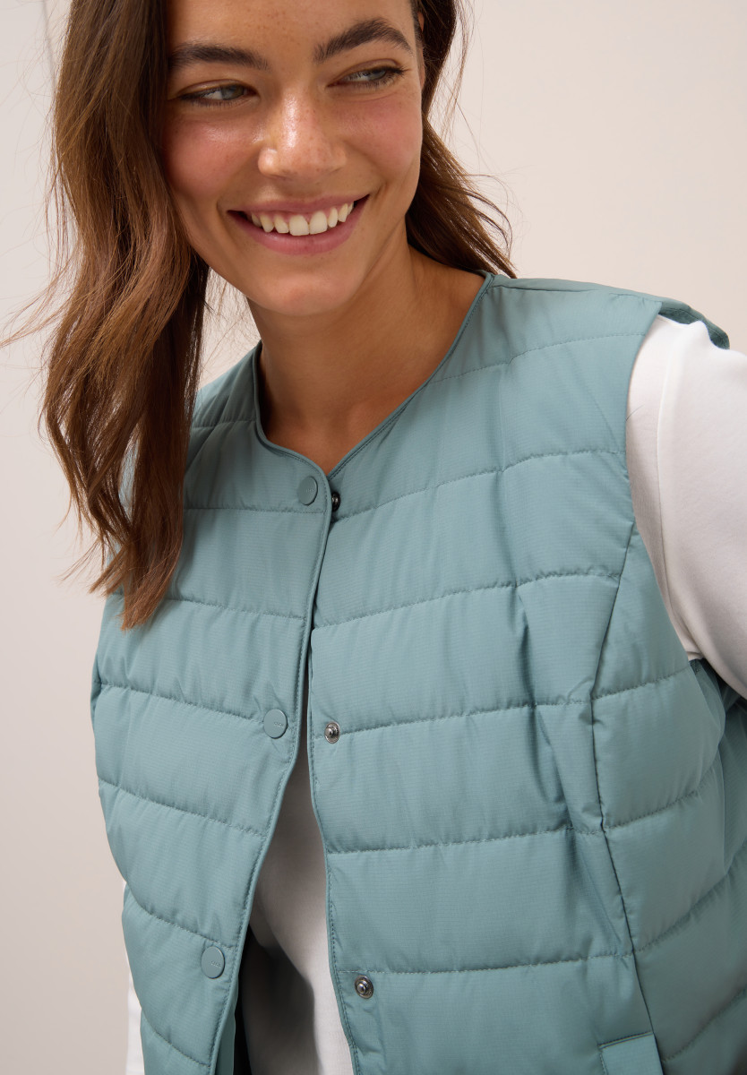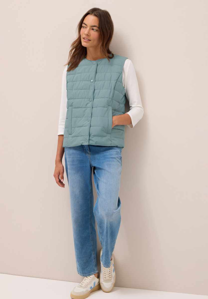 Diese gesteppte Weste von CECIL für Damen ist die ideale Wahl zum drunterziehen, wenn es abends kühler wird oder für ungemütliche Herbsttage. Sie ist perfekt fürs Layering unter Jacken und Mänteln geeignet und sorgt für ein warmes und gemütliches Tragegefühl. Tonale Details, seitliche Taschen und ein Druckknopf zur Ausschnittanpassung machen sie besonders praktisch. Leicht gesteppte Weste für Layeringlooks Seitliche Taschen Tonale Details Drockknopf innen zur Ausschnittanpassung Ideal zum Unterziehen für Jacken und Mäntel Material: Obermaterial: 100% Polyester; Futter: 100% Polyester; Füllung: 100% Polyester
