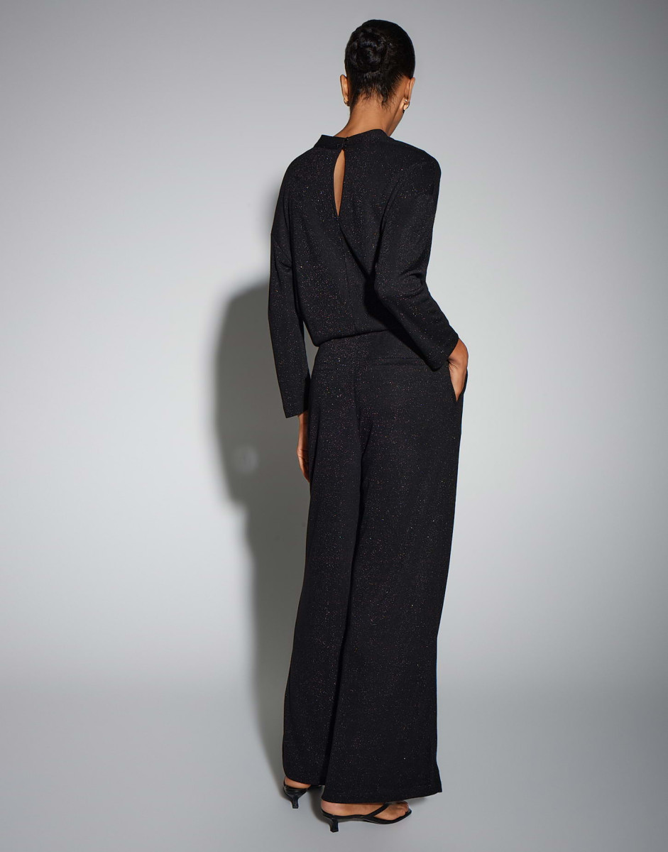 Die langen Ärmel und die definierte Taille, die durch eine feine Raffung betont wird, schaffen eine harmonische Balance. Ein besonderes Merkmal ist das weite, gerade geschnittene Bein (Wide Leg), das dem Overall eine zeitgemäße Eleganz verleiht und optisch streckt. Gefertigt aus einem weich fallenden, leicht strukturierten Material, bietet dieser Einteiler höchsten Tragekomfort und eine anspruchsvolle Ausstrahlung. Schließen lässt sich der Jumpsuit praktisch im Nacken. Er ist ein vielseitiger Ersatz für das klassische Abendkleid und benötigt nur minimale Accessoires.