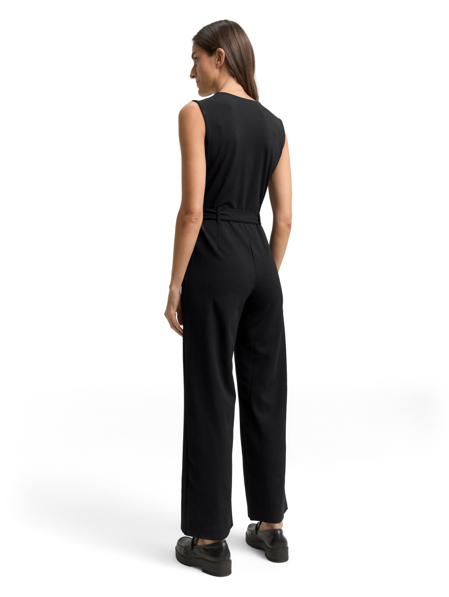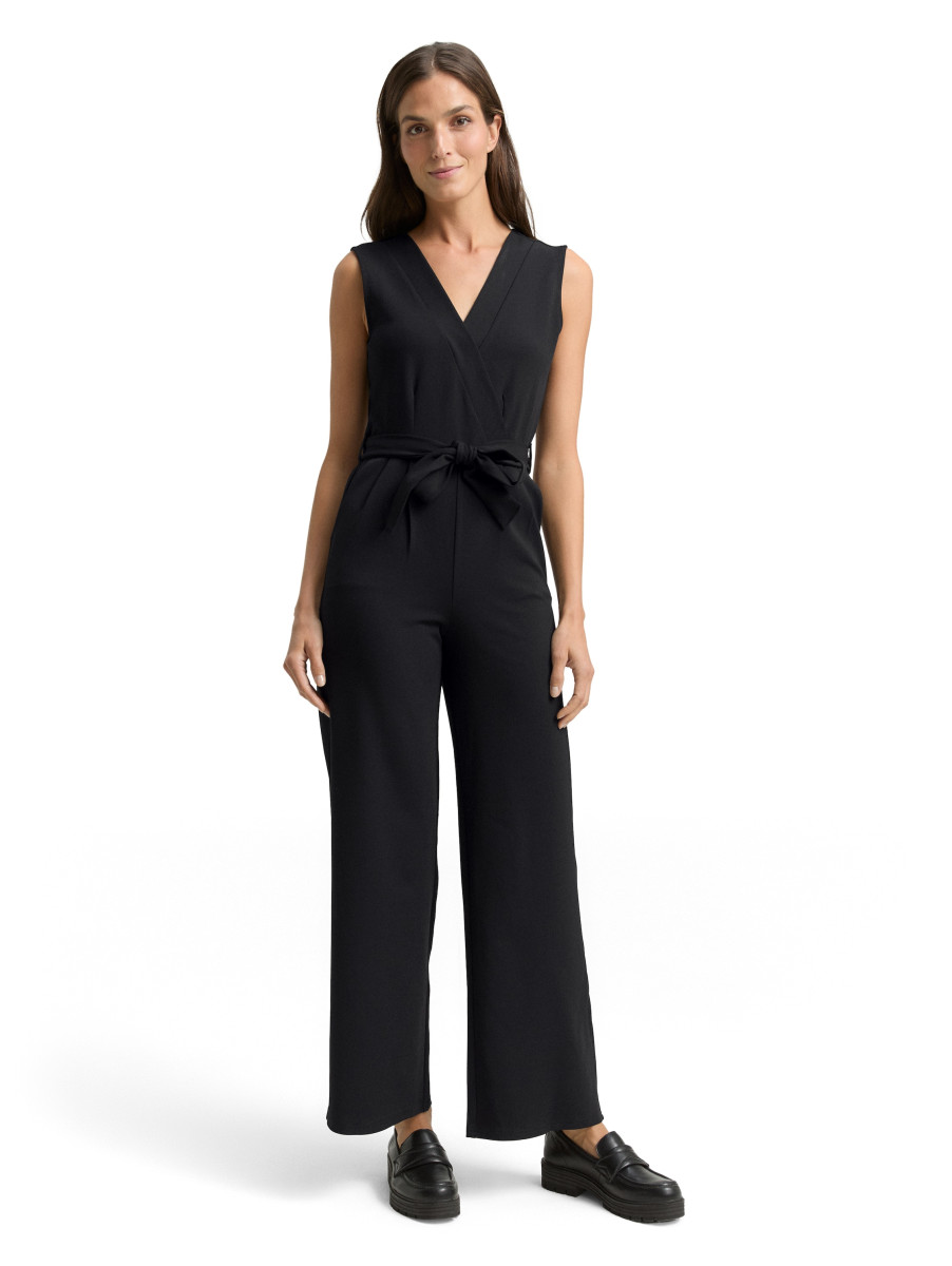 Ärmelloser Overall mit V-Ausschnitt, seitlichen Eingriffstaschen und Bindegürtel. Aus einem strukturierten Krepp-Material.
