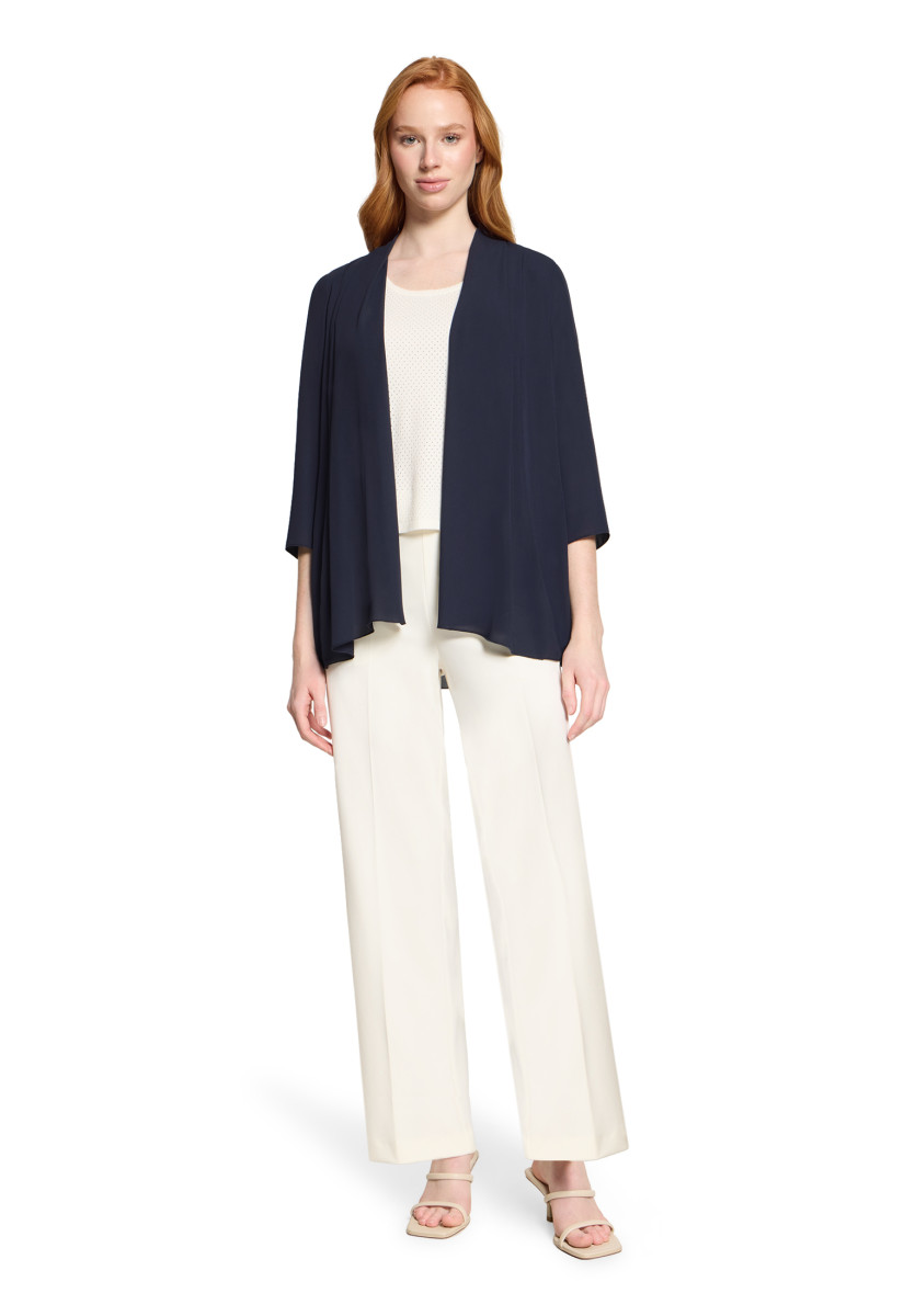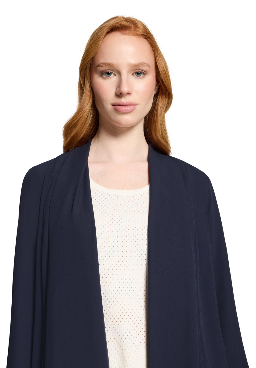 Die Damen Blusenjacke im Loose Fit überzeugt als leichte, offene Schicht mit Schalkragen und ohne Verschluss. Mit einer Gesamtlänge von 72 cm und langen Ärmeln entsteht eine lässige Silhouette; die Länge ab Taille beträgt 30 cm und sorgt für harmonische Proportionen. Das einfarbige Modell ist aus Chiffon gefertigt und lässt sich vielseitig kombinieren.Lief.-Art-Nr: 03934011