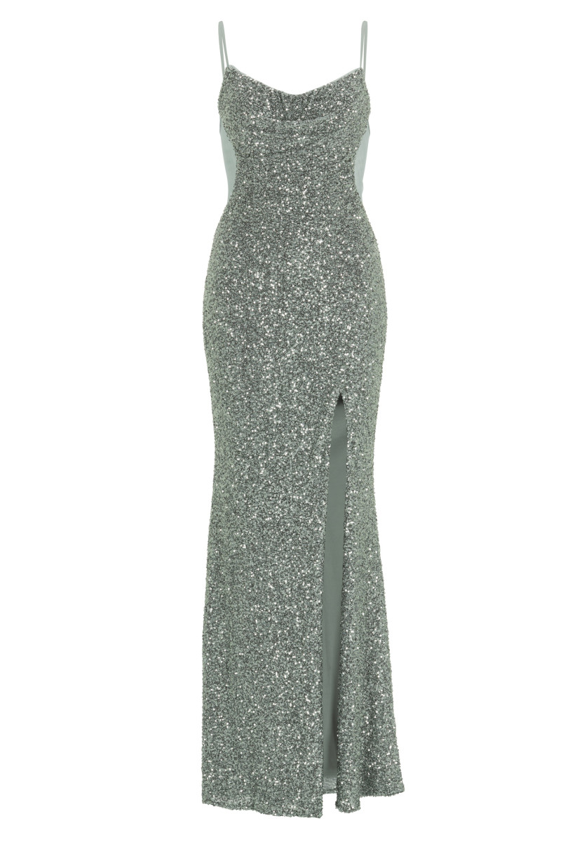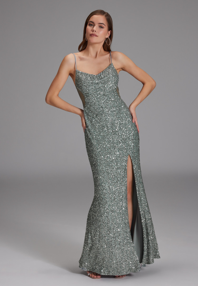 Das Allover paillettenbesetzte Slipdress funkelt und sorgt mit aufregenden Details für einen echten Eyecatcher: feine Träger, anmutender Wasserfallausschnitt und ein transparenter Rücken bringen deinen Look zum strahlen.