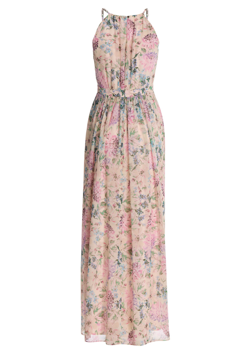 Elegantes Abendkleid mit floralem Druck und zarten Zierträgern, das durch seine feminine Silhouette besticht. Der fließende Fall und die leichte Qualität sorgen für angenehmen Tragekomfort bei festlichen Anlässen. Das Modell lässt sich stilvoll zu hohen Schuhen und dezentem Schmuck kombinieren und ist eine elegante Wahl für besondere Gelegenheiten.Lief.-Art-Nr: 5AK19100
