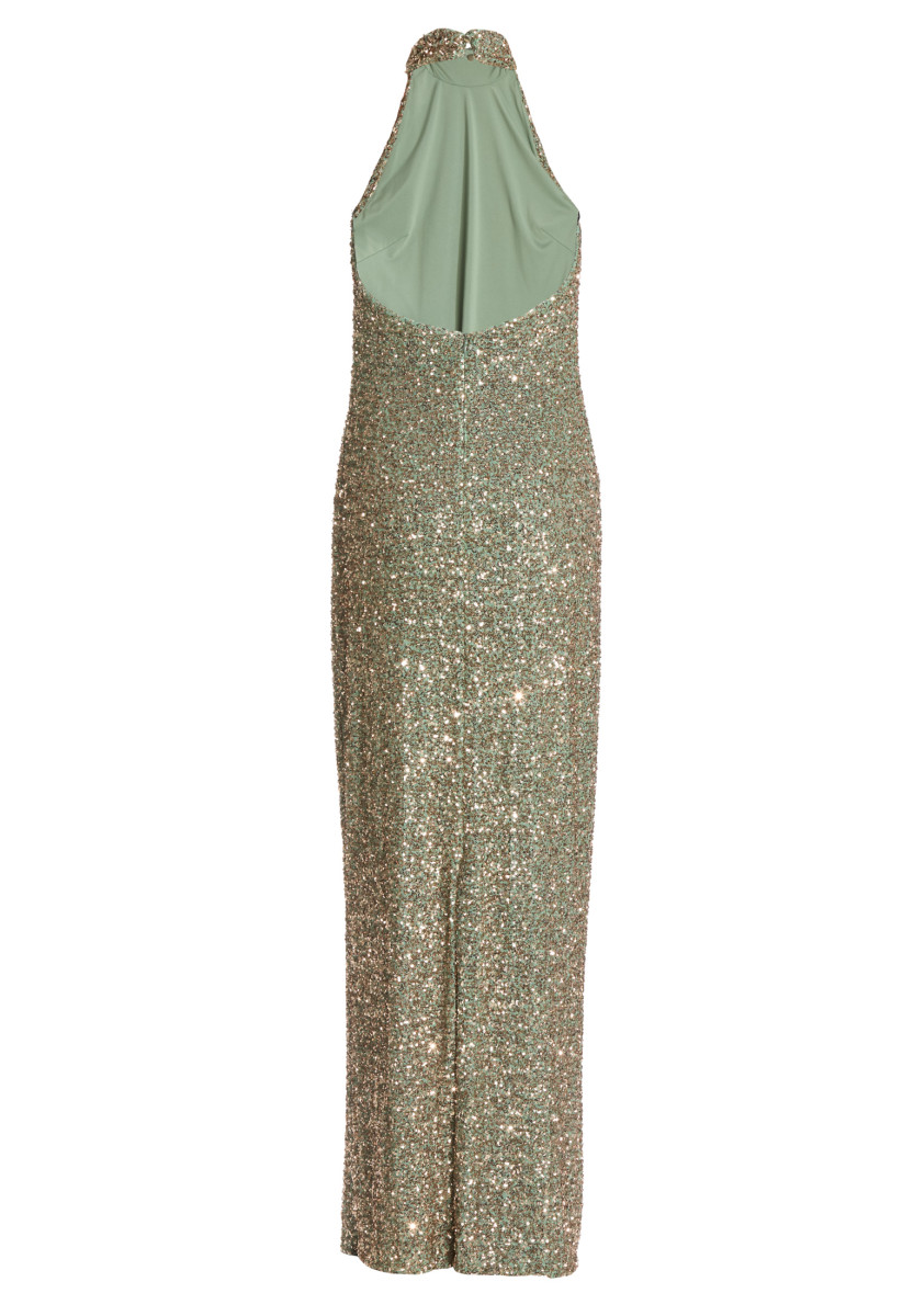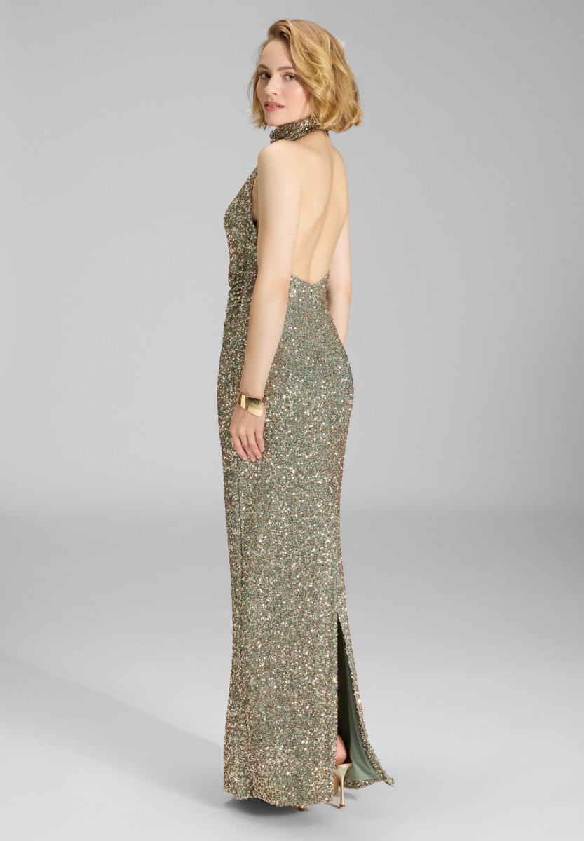Das figurbetonte Paillettenkleid mit Drapierung am Kragen ist ein elegantes Abendkleid für besondere Anlässe. Drapierte Details am Kragen und funkelnde Pailletten setzen feminine Akzente und betonen die Silhouette. Es besticht durch eine schmeichelnde Passform und lässt sich vielseitig mit dezentem Schmuck und hohen Schuhen zu festlichen Looks kombinieren.