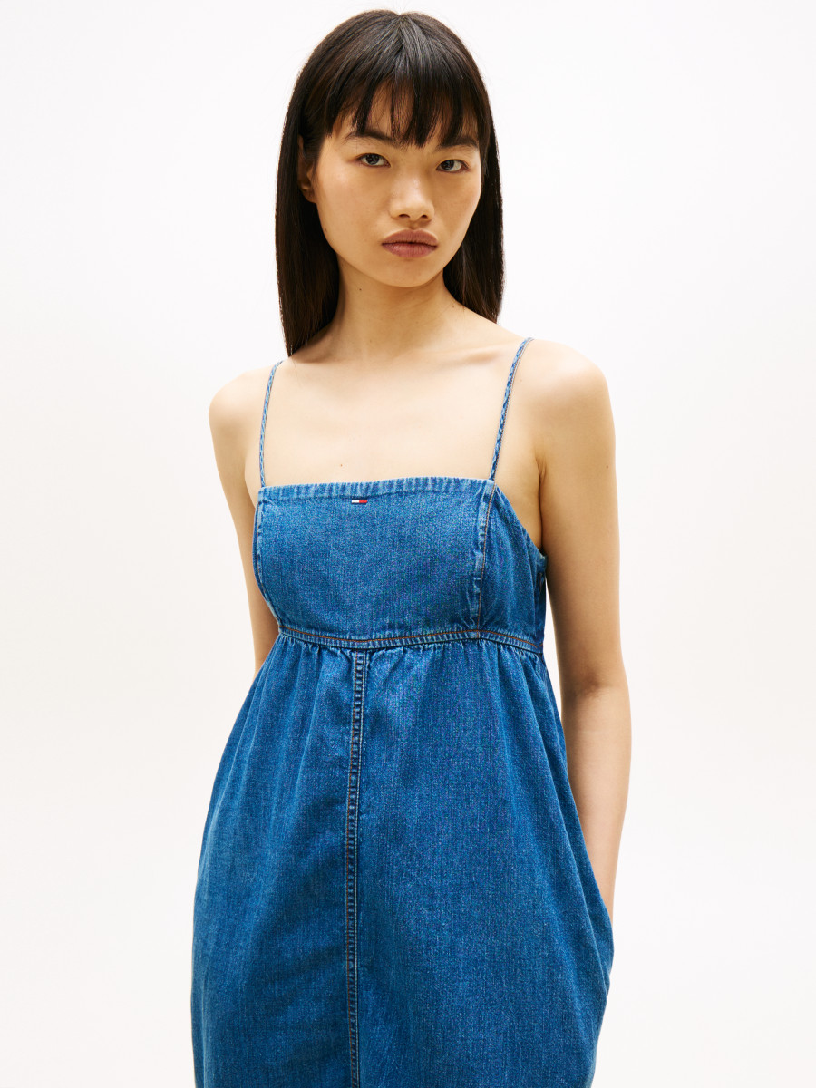 Dieses taillierte Maxikleid mit filigranen Spaghettiträgern bietet einen femininen Sommerlook und sitzt figurbetont. Verstellbare Träger, Rückensmirring und kontrastierende Ziernähte sorgen für ansprechende Details und einen abwechslungsreichen Look. Das leichte Chambray-Material und die Maxilänge machen das Kleid zur idealen Wahl für warme Tage.Lief.-Art-Nr: DW0DW22342/TJW CHAMBRAY MAXI DRESS EXT
