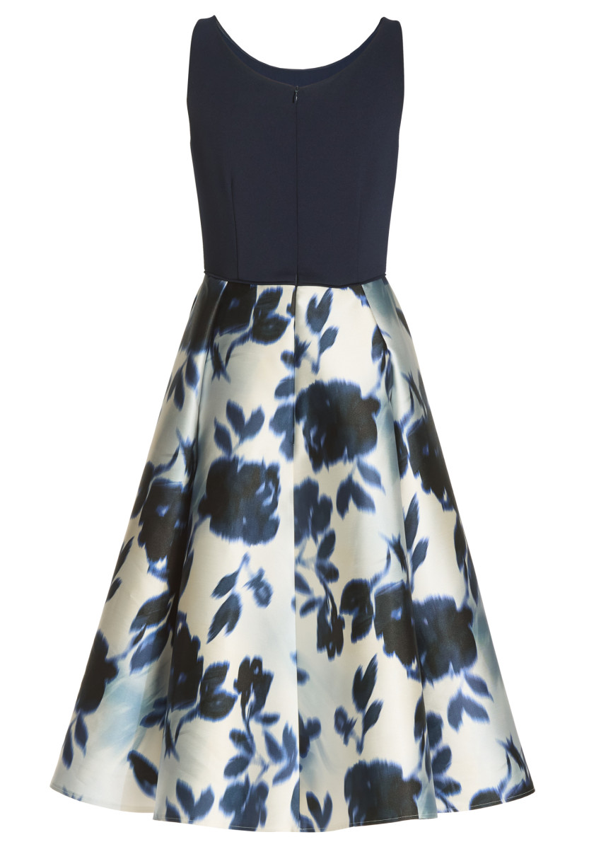 Der Rock ist der Blickfang des Kleides, gestaltet mit einem großflächigen, aquarellartigen Blütenmuster, das von hellen Grundtönen dominiert wird. Die Taillenpartie ist klar definiert, was eine vorteilhafte Sanduhr-Silhouette schafft. Das fließende Material des Rocks verleiht dem Kleid Bewegung und Volumen, ideal für festliche Anlässe, Hochzeiten oder Cocktailevents. Mit seiner knielangen Passform strahlt dieses Kleid Anmut aus und ist eine stilvolle Wahl für jede Gelegenheit, bei der ein eleganter Auftritt gefragt ist.