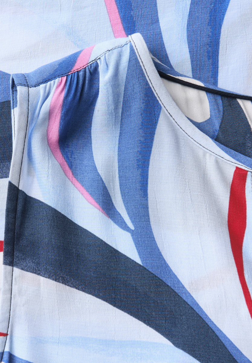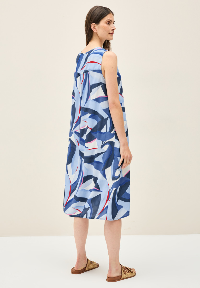 Das grafisch gemusterte Midi-Kleid von CECIL für Damen überzeugt durch seine fließende Silhouette. Mit geschlitztem Ausschnitt samt Bändern und ärmellosem Schnitt ist es ideal für den Sommer. Die weich fallende Qualität bietet dir dabei optimalen Tragekomfort. Midi-Kleid Split Neck mit Bändern Ärmellos Grafisches Muster Weich fallend Material: 100% Viskose