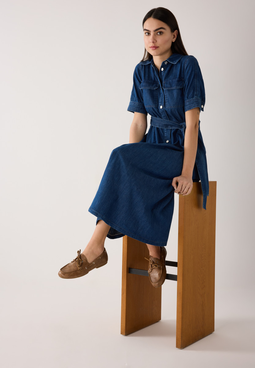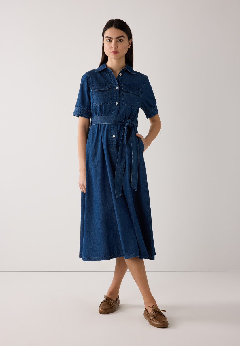 Maxilanges Hemdblusenkleid | Oben schmal, weiter Rock | Taillen-Gummizug und Gürtel aus Oberstoff | Kurze Knopfleiste und Kragen | Brusttaschen mit Patten | Schräge Einschubtaschen | Kurze Ärmel mit Manschette und Knopf | Ungefüttert