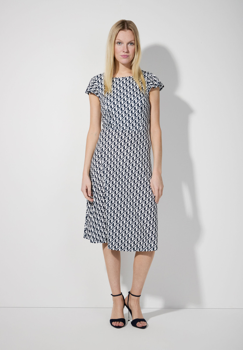 Schlicht aber wirkungsvoll präsentiert sich das leichte Jerseykleid von MORE & MORE mit grafischem Print in marine/ecru und femininer Silhouette. Es kann mit Cardigan kurzem Blazer oder ganz pur gestylt werden und ist dazu auch noch wahnsinnig bequem und pflegeleicht. Ein perfektes Kleid für viele Gelegenheiten: City Business Dinner und Reisen.