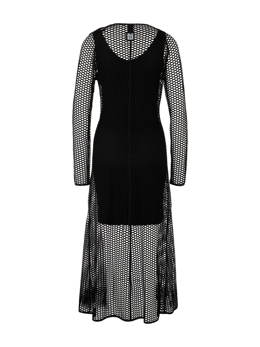 Langes Kleid in Netz | Langes Kleid in stretchigem Netz. Das Modell hat eine körpernahe Form, die durch Wiener Nähte modelliert ist. Dekolletee und Säume sind mit einer Paspel eingefasst. Das Netz ist semitransparent und das Kleid ist mit opakem Slipdress (Unterkleid) zu tragen. Ein Style-Statement für Parties und Events. Körpernah | Ausgestellt | Langarm | Mit Slipdress | Das Model ist 179 cm groß und trägt N3/38.