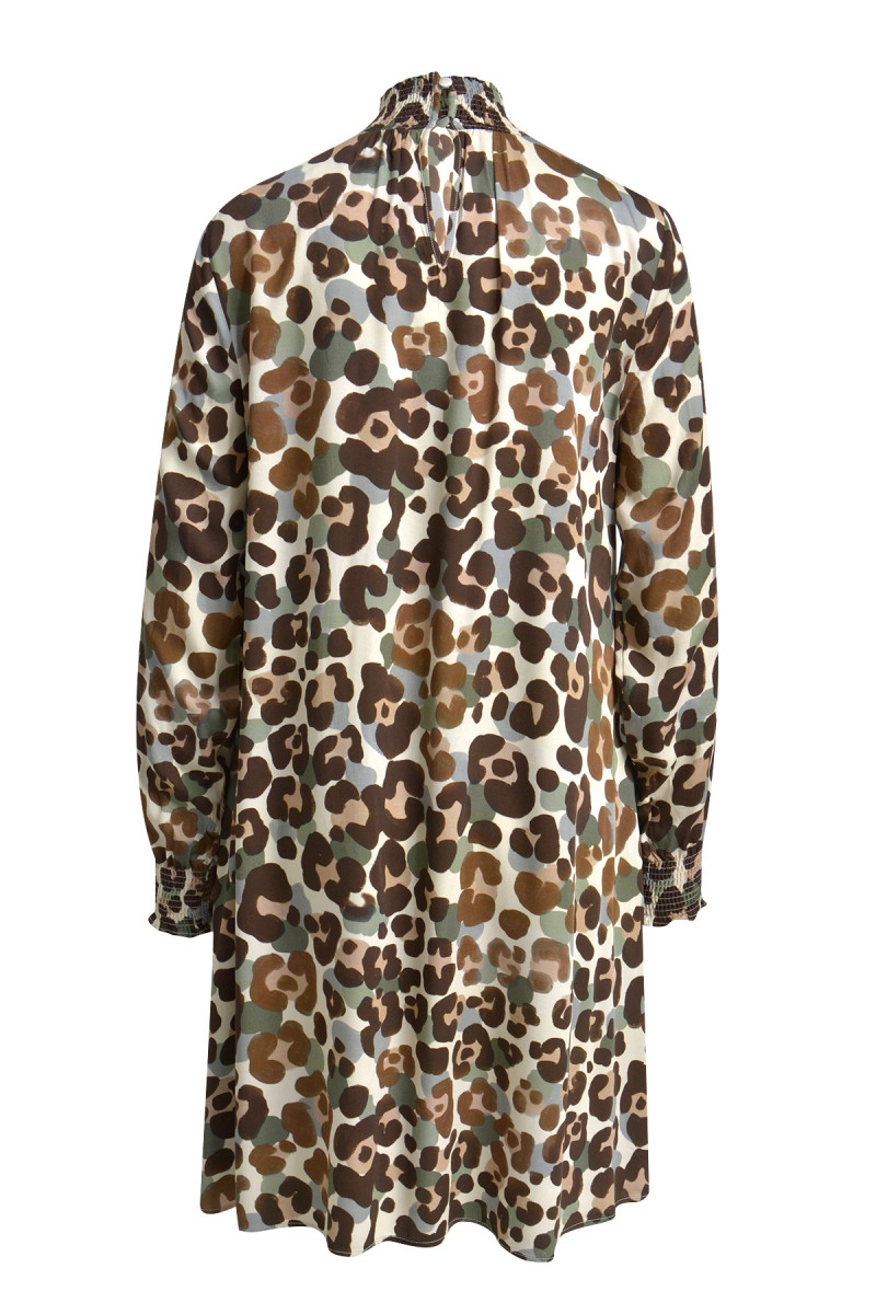 Erweitern Sie Ihre Garderobe mit diesem trendigen Minikleid, das einen modernen Twist des klassischen Leo-Prints bietet. Das Animal-Print-Muster in gedeckten, natürlichen Tönen wie Braun, Beige, Olivgrün und Taupe ist aktuell und lässt sich vielseitig kombinieren.