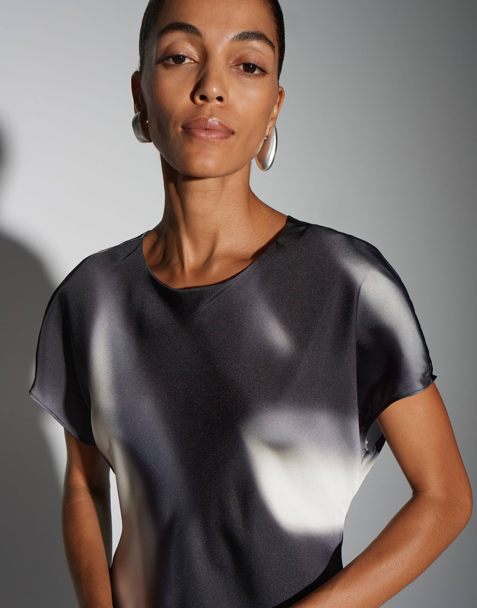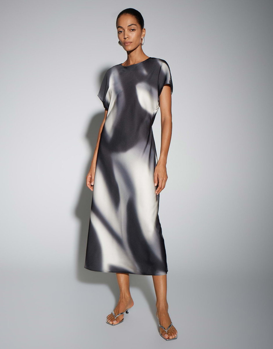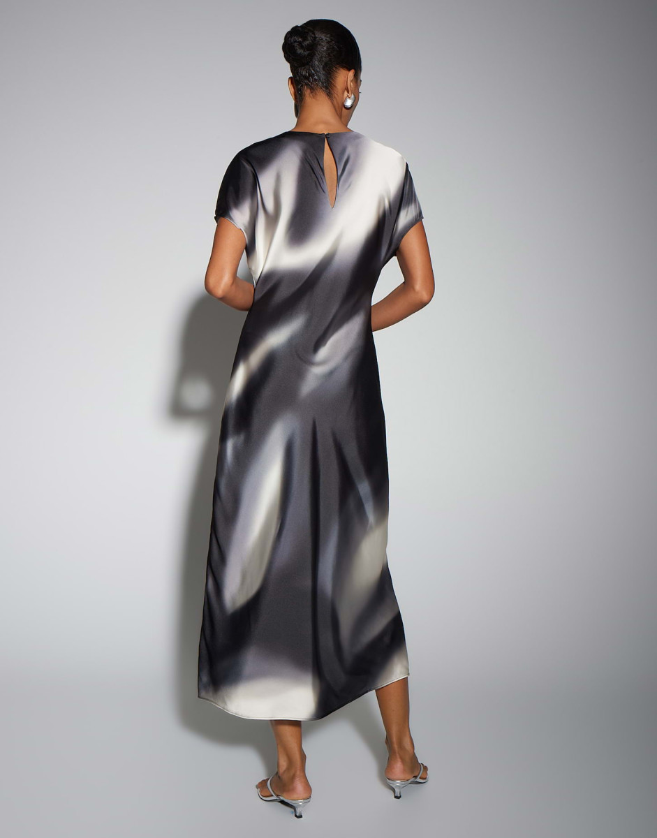 Das Kleid ist mit einem abstrakten Muster versehen, das weiche, verwischte Übergänge und Formen zeigt und dem Kleid eine moderne, künstlerische Note verleiht. Der Schnitt ist klassisch und leicht tailliert, fällt aber ab der Taille locker bis zur Wadenmitte. Der schlichte, runde Halsausschnitt wird durch kurze, überschnittene Ärmel ergänzt, die die Schulterpartie elegant umspielen.