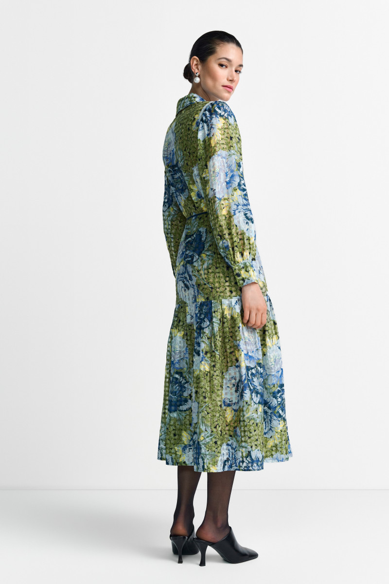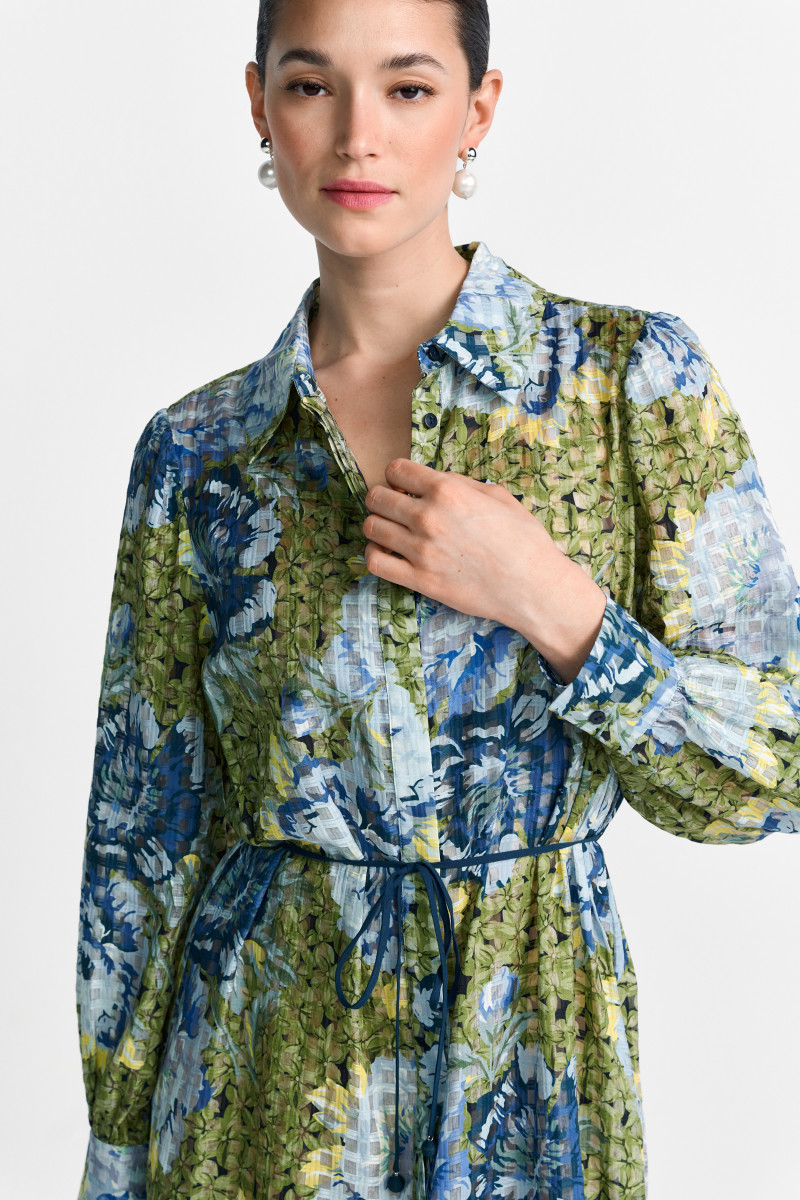 Das Kleid besticht durch sein ausdrucksstarkes Muster: Es kombiniert ein großflächiges, romantisches Blumenmotiv in Tönen von hellem und intensivem Blau mit einem subtilen, karierten Hintergrund in einem gedeckten Olivton. Diese Musterkombination verleiht dem Kleid eine Tiefe und einen modernen Look. Die Taille wird durch einen dünnen, farblich passenden Bindegürtel akzentuiert, der die Silhouette feminin formt. Der Rockteil ist in gestuften Volants (Tiers) gearbeitet, die dem Kleid bei jeder Bewegung ein schönes Volumen und eine fließende Bewegung verleihen. Die langen Ärmel enden in schlichten Manschetten. Gefertigt aus einem leichten, strukturierten Material, ist dieses Kleid ideal für den Übergang und lässt sich sowohl elegant mit Stiefeln als auch lässig mit Sneakers kombinieren.