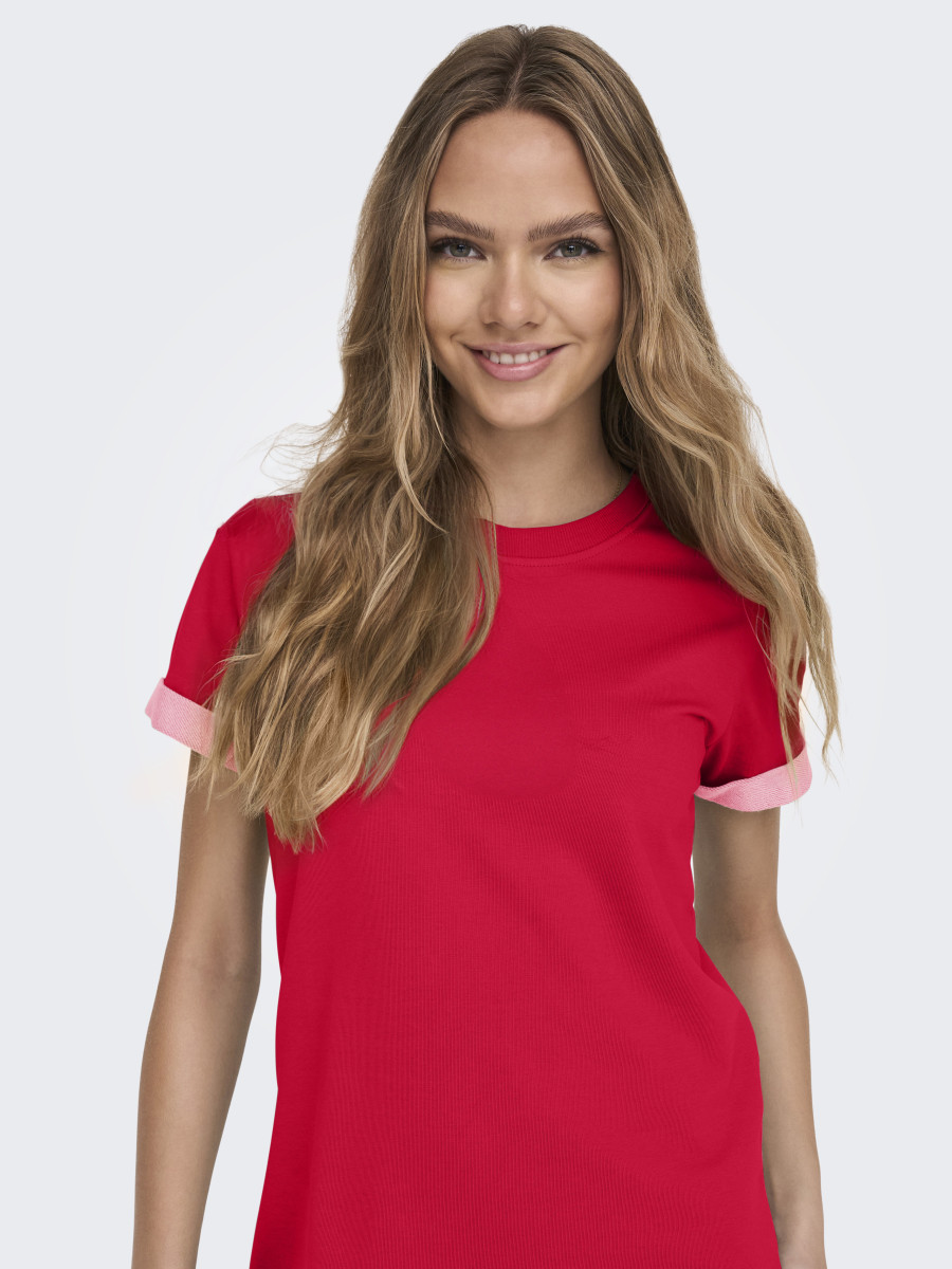 Rundhals | Kurzarm | Ärmel mit Umschlag | Normal geschnitten | Abgerundeter Saum | Hinten länger