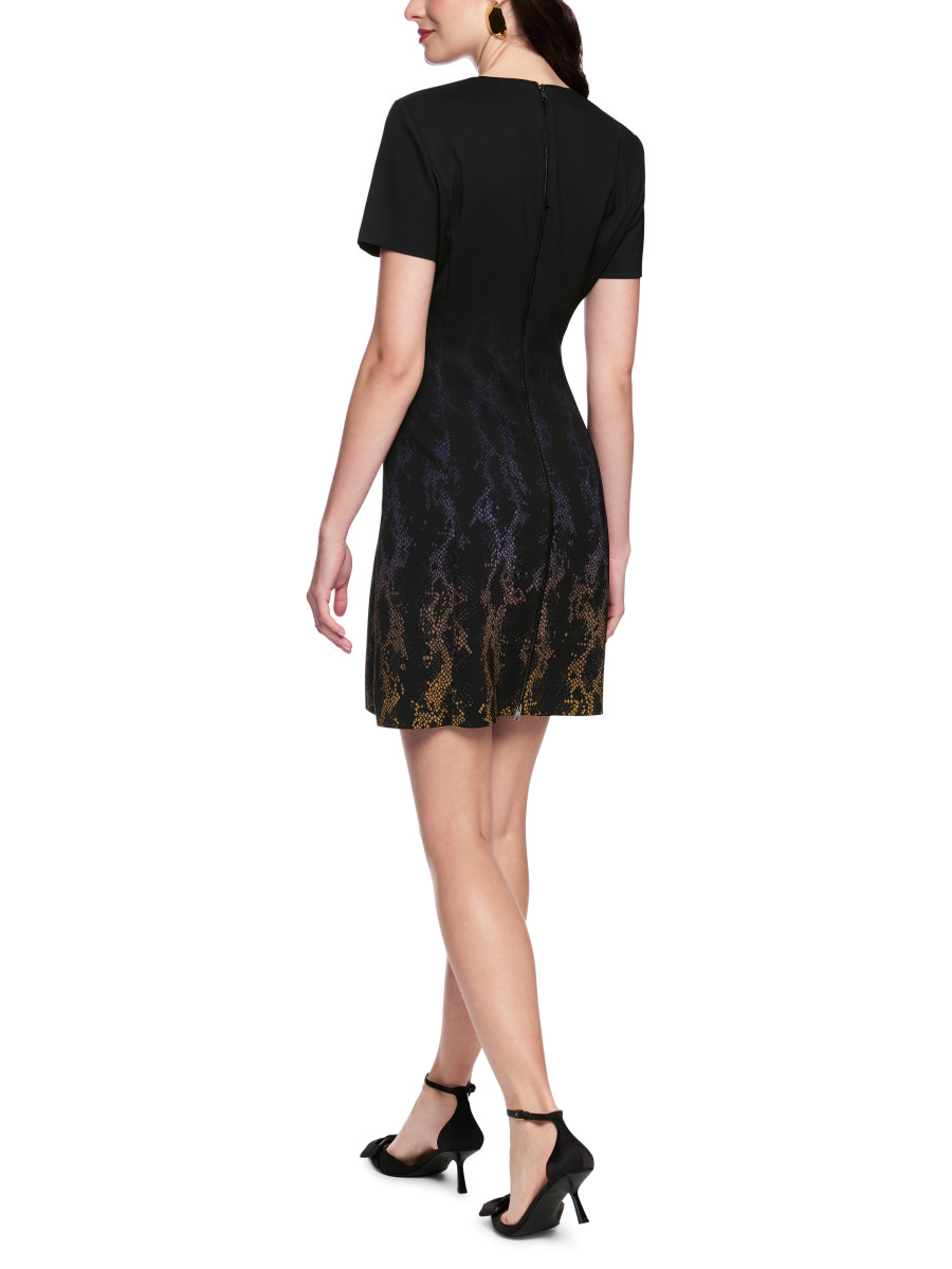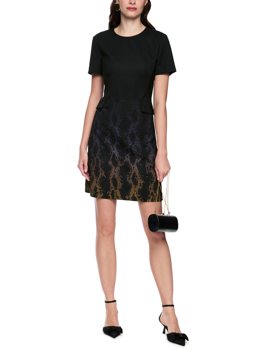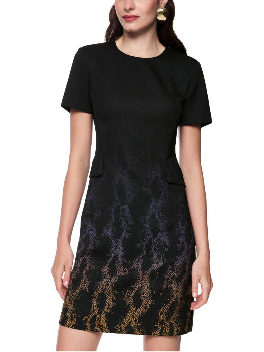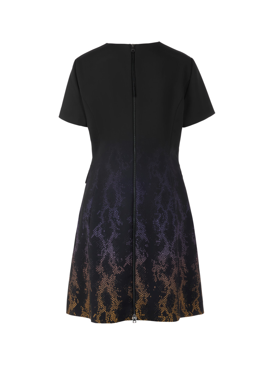 Modernes Kleid mit kurzen Ärmeln und klassischem Rundhalsausschnitt. Der Rockteil im trendigen Snakeprint setzt einen auffälligen Akzent, während das Innenfutter für angenehmen Tragekomfort sorgt. Auf der Rückseite rundet ein durchgängiger Zwei-Wege-Reißverschluss das Design funktional und stilvoll ab.