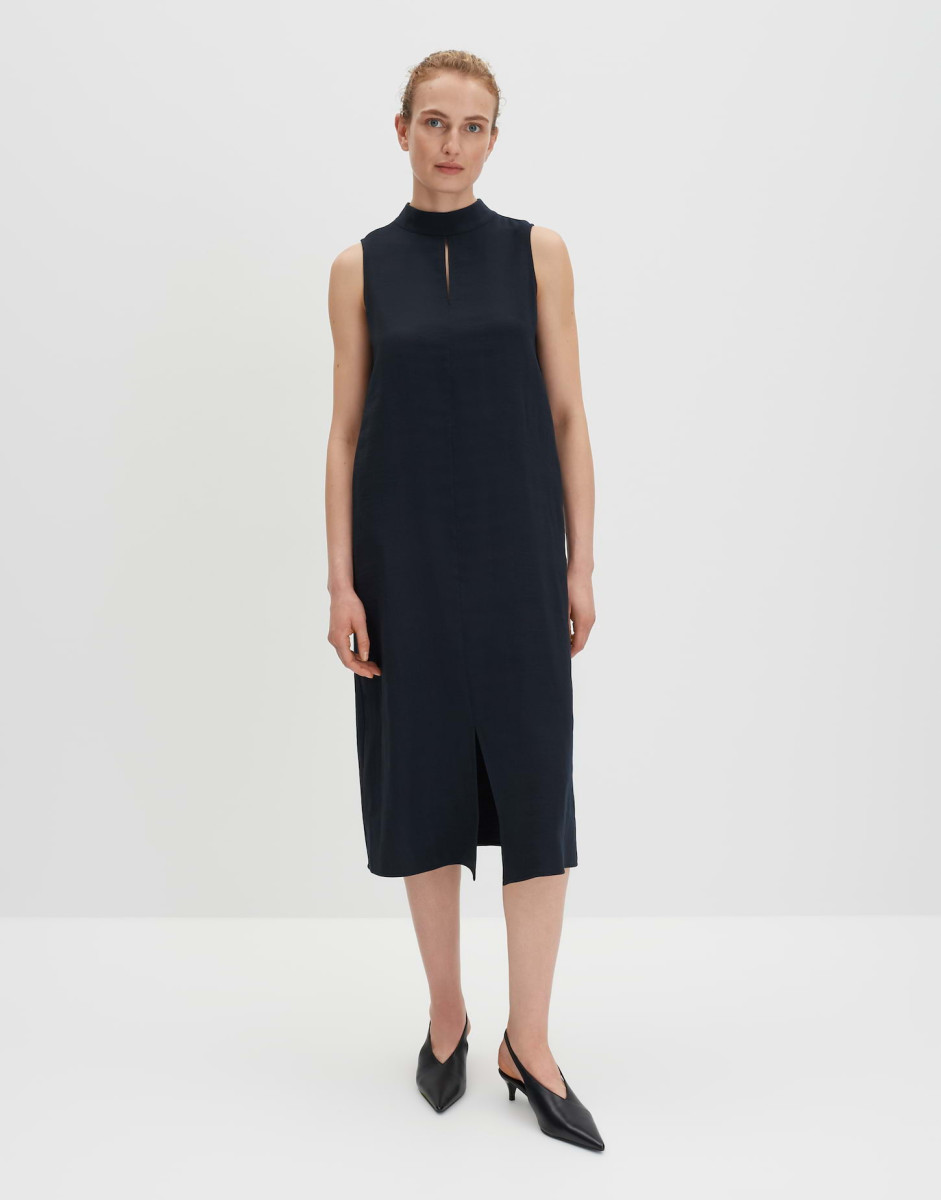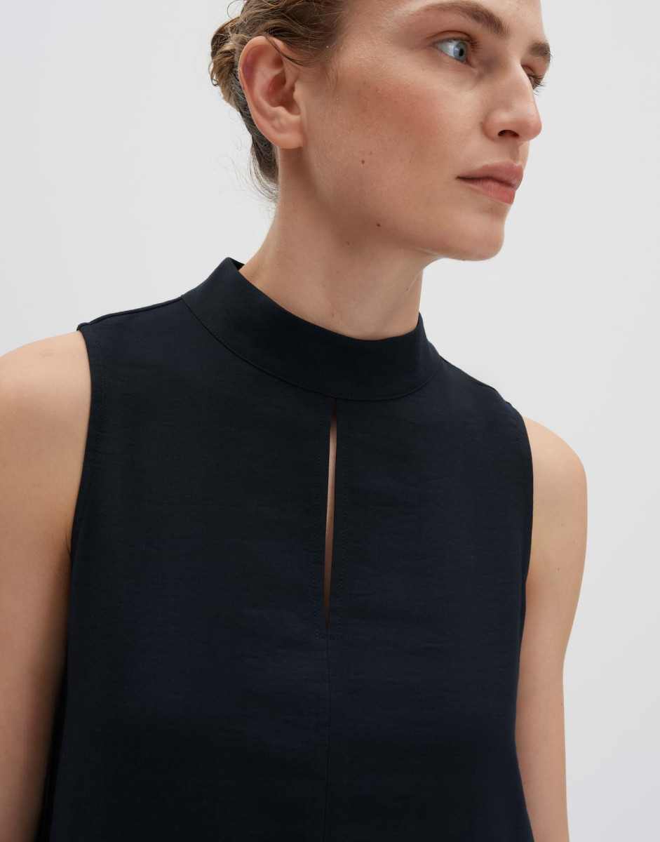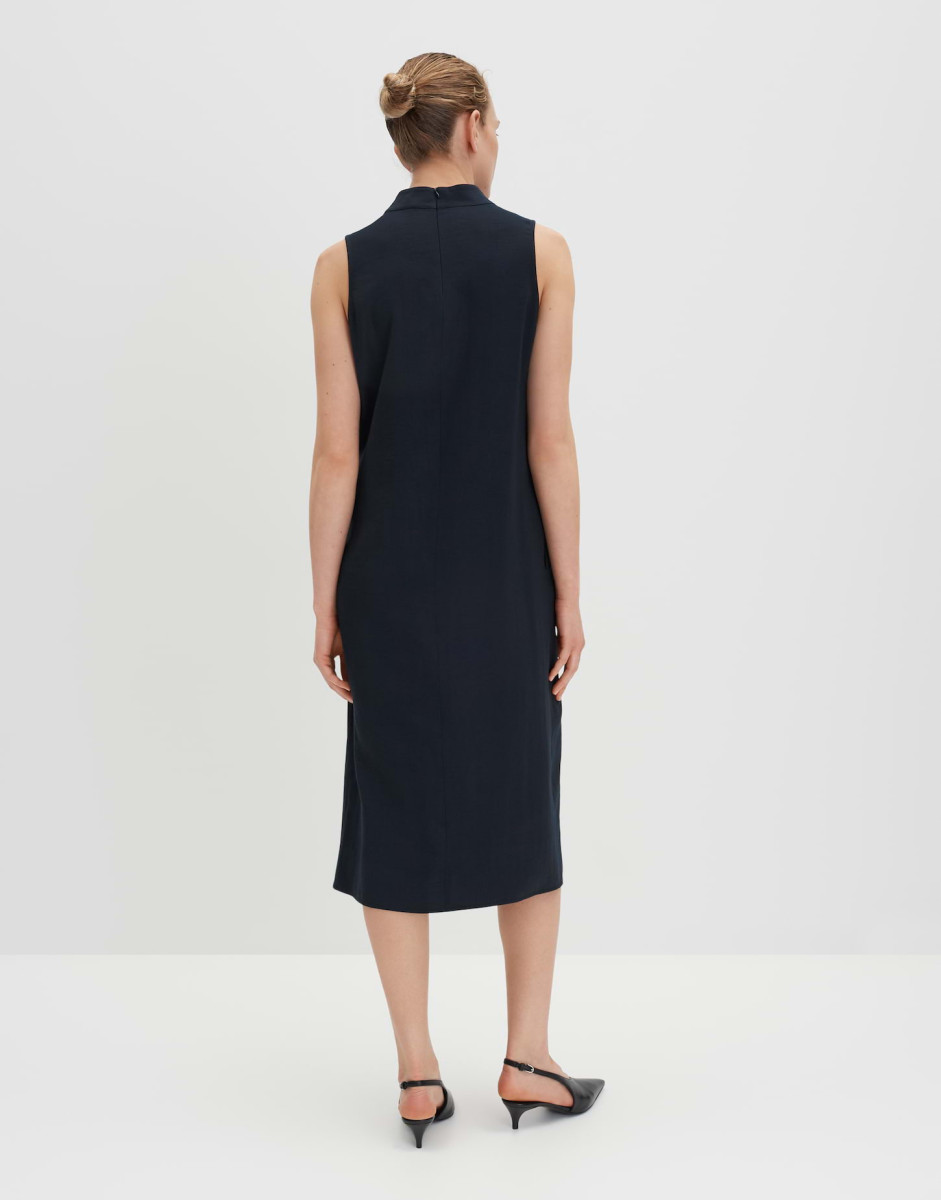 Lockere Passform | Leicht Ausgestellt Geschnitten | Midi-Länge | Ärmellos | Stehkragen | Rückenlänge Ca. 115 Cm Bei Größe 36 | Model Größe 178 Cm – Trägt Größe 36 | Webware | Gekreppte Oberfläche | Natürlicher Griff | Fließender Fall | Nahttaschen In Der Seitennaht | Reißverschluss Hinten | Schlitz Vorne