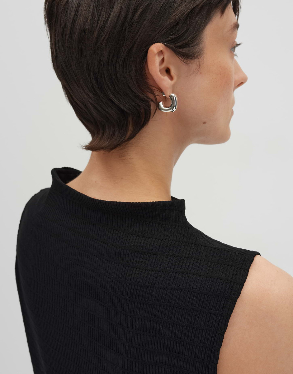 Schmale Passform | Gerader Schnitt | Midi-Länge | Ärmellos | Stehkragen | Rückenlänge ca. 111 cm bei Größe 36 | Model Größe 176 cm – trägt Größe 36 | Jersey | Unregelmäßige Rippstruktur | Natürlicher Griff | Elastischer Stoff | Fließender Fall | Schlitze in den Seiten