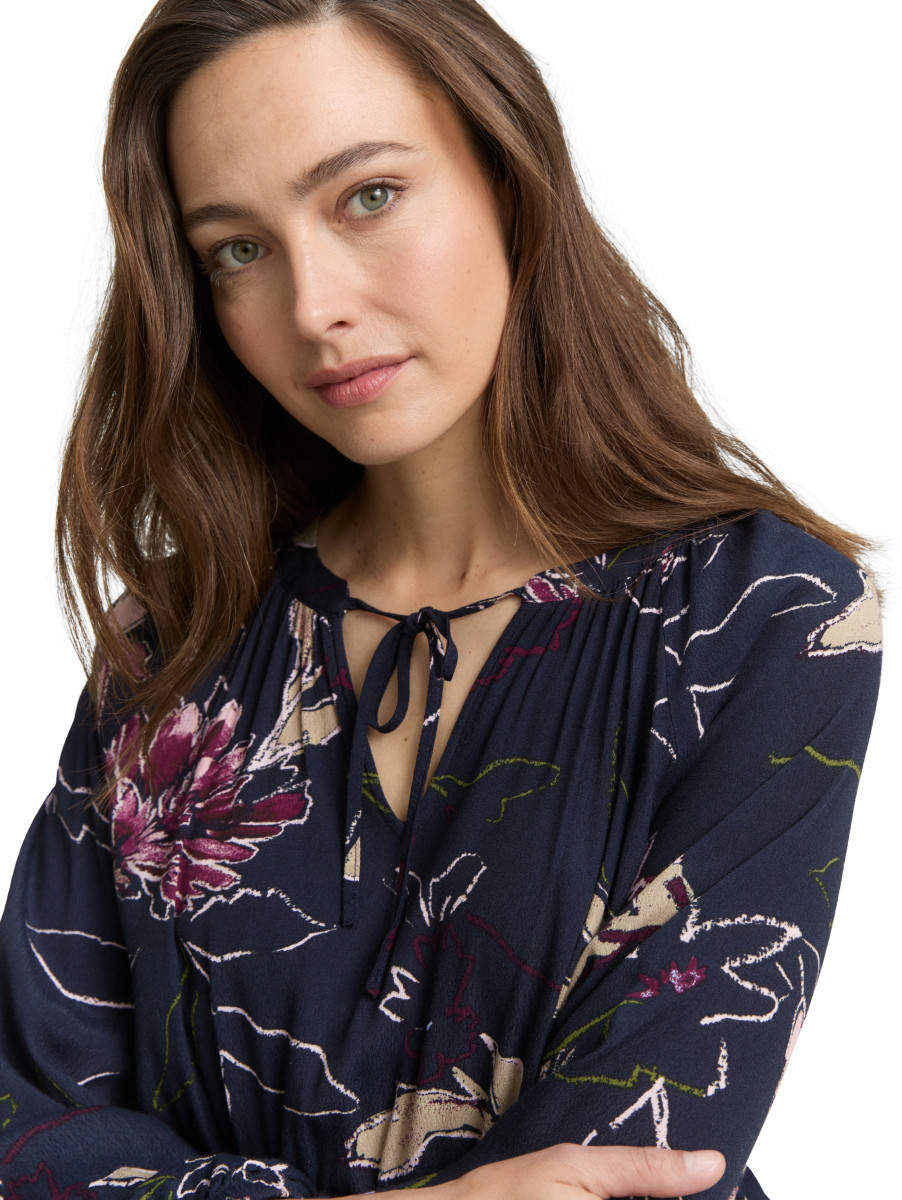 Langes Kleid mit Blumen-Allover-Print und elastischem Gummibund an der Taille und am Ärmelsaum. Mit Kordelzug und leichten Raffungen am Ausschnitt sowie Seitenschlitzen für mehr Bewegungsfreiheit. Aus einem strukturierten Krepp-Material. Regular Fit - gerader Schnitt