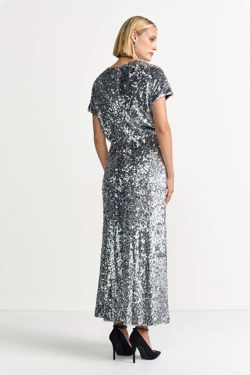 Dieses glamouröse Maxi-Paillettenkleid in Silber ist das perfekte Highlight für besondere Anlässe und festliche Events. Das bodenlange Abendkleid besticht durch sein funkelndes Design und eine elegante Silhouette, die die weibliche Form betont. Hochwertige Pailletten sorgen für einen luxuriösen Look, während der Schnitt optimalen Tragekomfort bietet. Ein zeitloses Statement-Piece für Partys oder Galas, das in keiner anspruchsvollen Garderobe fehlen darf.