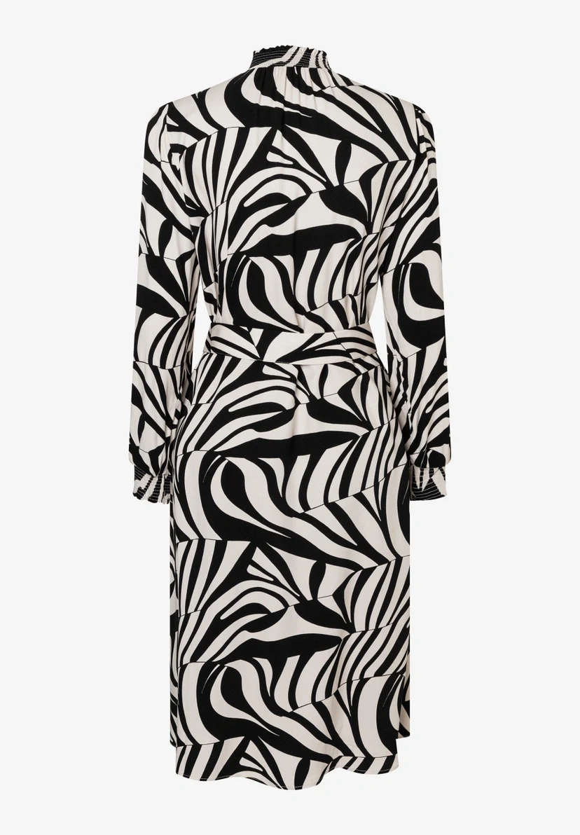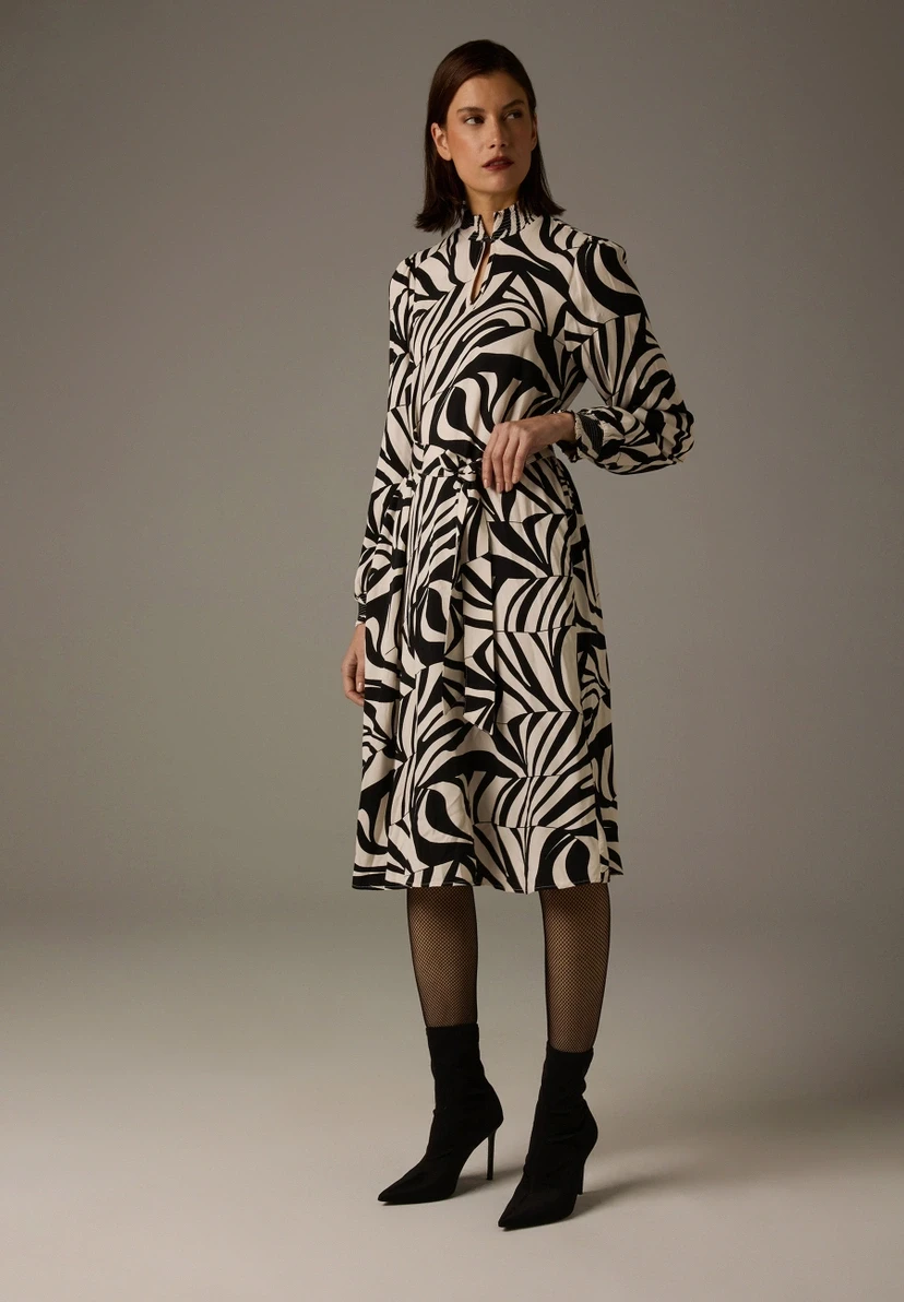 Midi-Länge | Weit und figurkaschierend | Gesmokter Stehkragen mit Knopf | Lange, weite Ärmel mit gesmokten Abschlüssen | Formgebender Taillengürtel aus Oberstoff | Seitliche Einschubtaschen | Ungefüttert