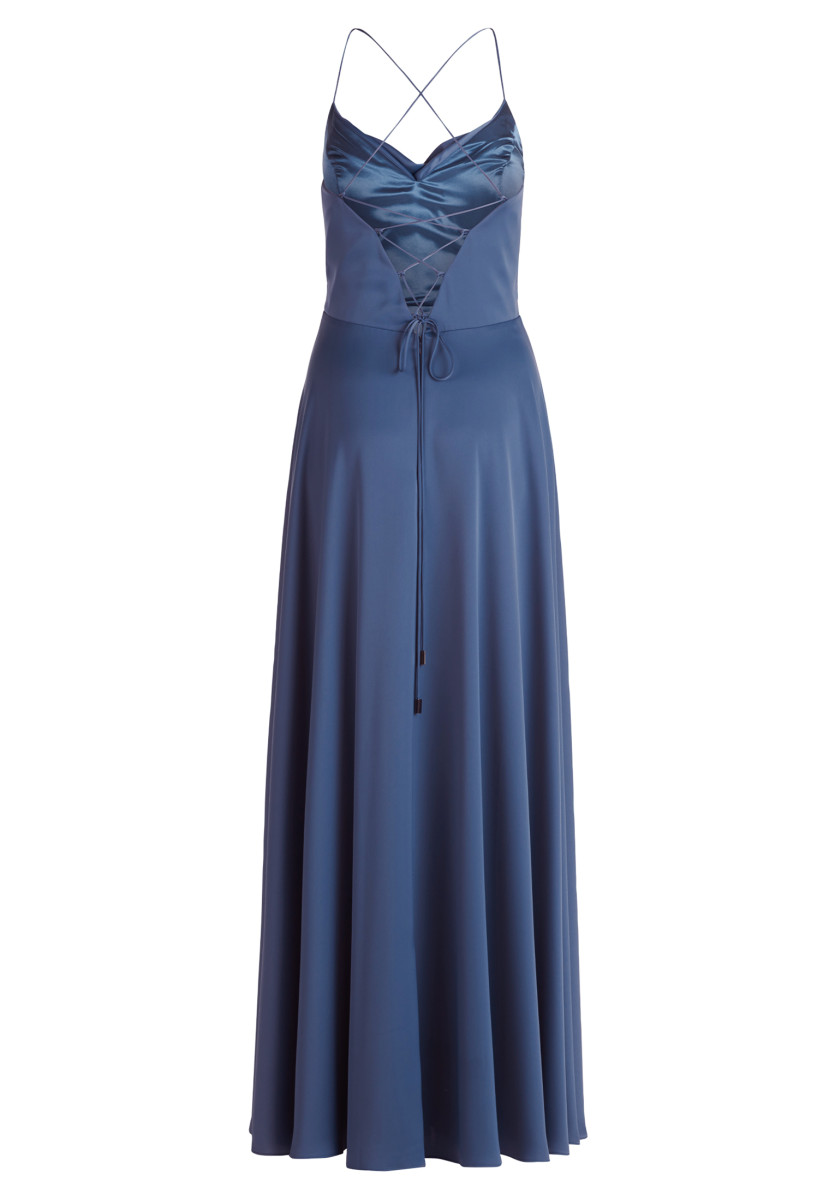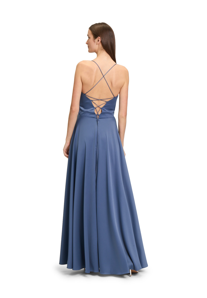 Passform: Figurumspielend | Gesamtlänge: 154 cm | Länge ab Taille: 112 cm | Feinmaterial: Satin | Ärmel: Ohne Arm | Ausschnitt: Wasserfallausschnitt | Längeninfo: Maxi | Trägerart: Spaghetti | Verschluss: Reißverschluss, Schnürung | Muster: Uni | Futter: 100% Polyester