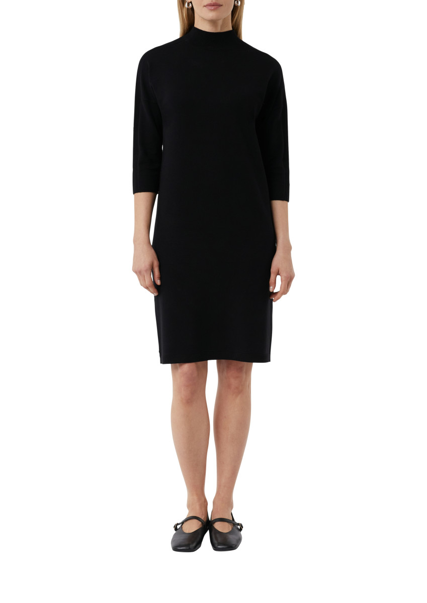 Das weiche Feinstrickmaterial mit elastischem Anteil sorgt für hohen Tragekomfort und eine schmeichelhafte Passform. Ein Stehkragen und gerippte Abschlüsse verleihen dem Kleid eine elegante Note, während 3/4-Ärmel mit überschnittenen Schultern eine entspannte Silhouette schaffen. Ob solo getragen oder in Lagenlooks kombiniert – dieses vielseitige Kleid lässt sich mühelos vom Tages- ins Abend-Outfit verwandeln.