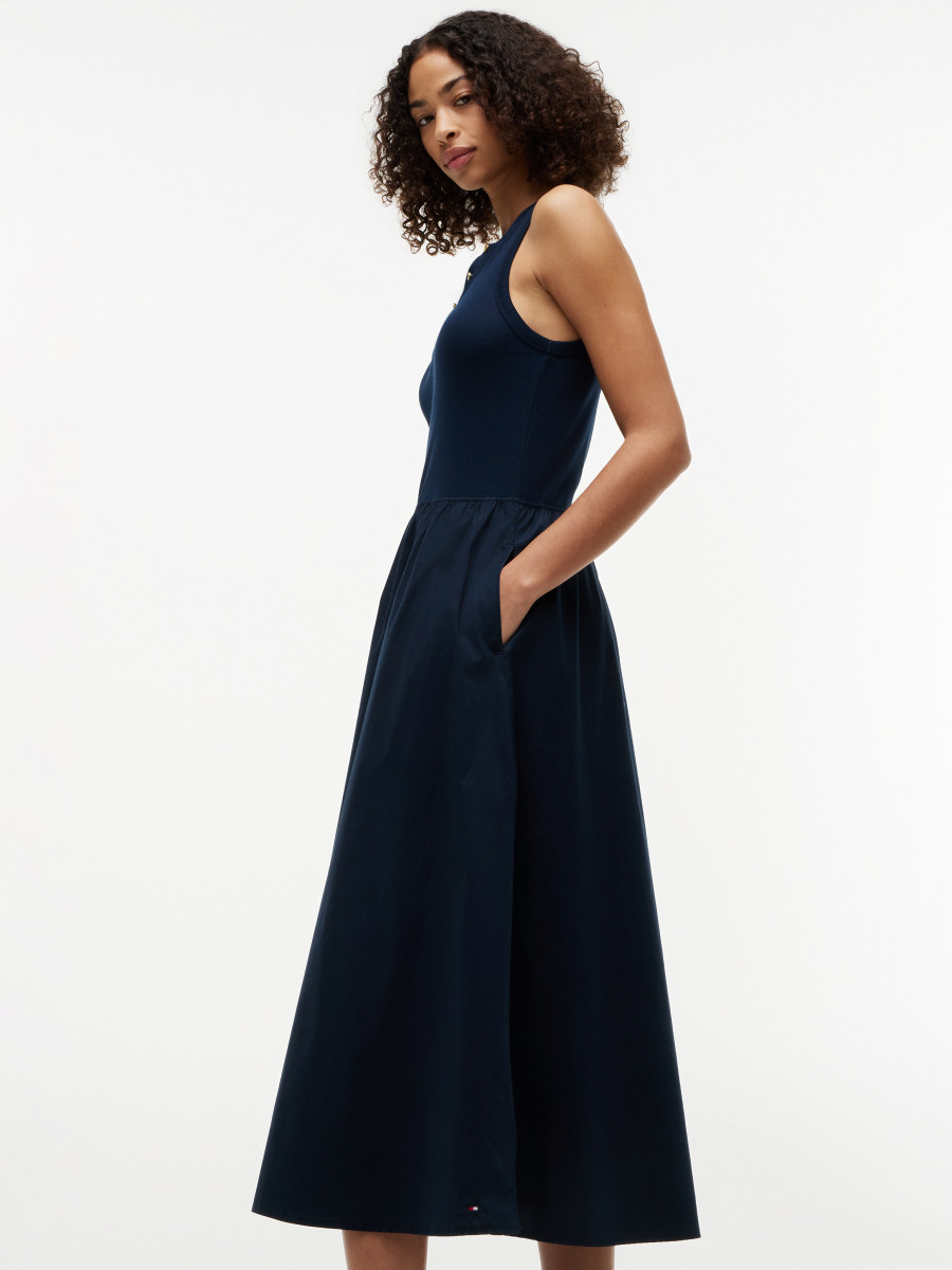 Dieses lange Kleid ist eine elegante Wahl für den Alltag und besondere Anlässe. Die ärmellose Schnittführung sorgt für einen leichten, sommerlichen Look und hohen Tragekomfort. Das zeitlose Design lässt sich vielseitig kombinieren und rundet Ihre Garderobe stilvoll ab.Lief.-Art-Nr: WW0WW49628/GOLD BTN POPLIN MIX TANK DRS
