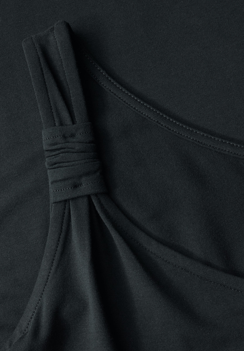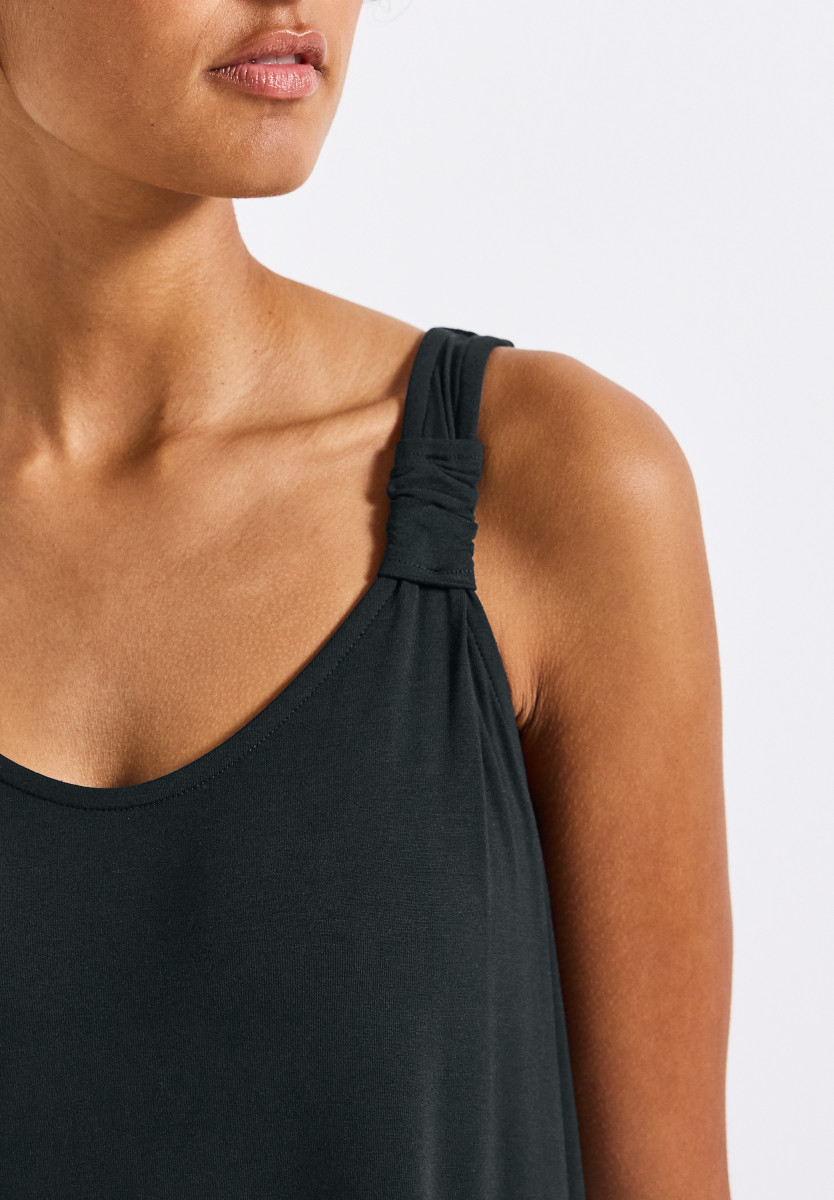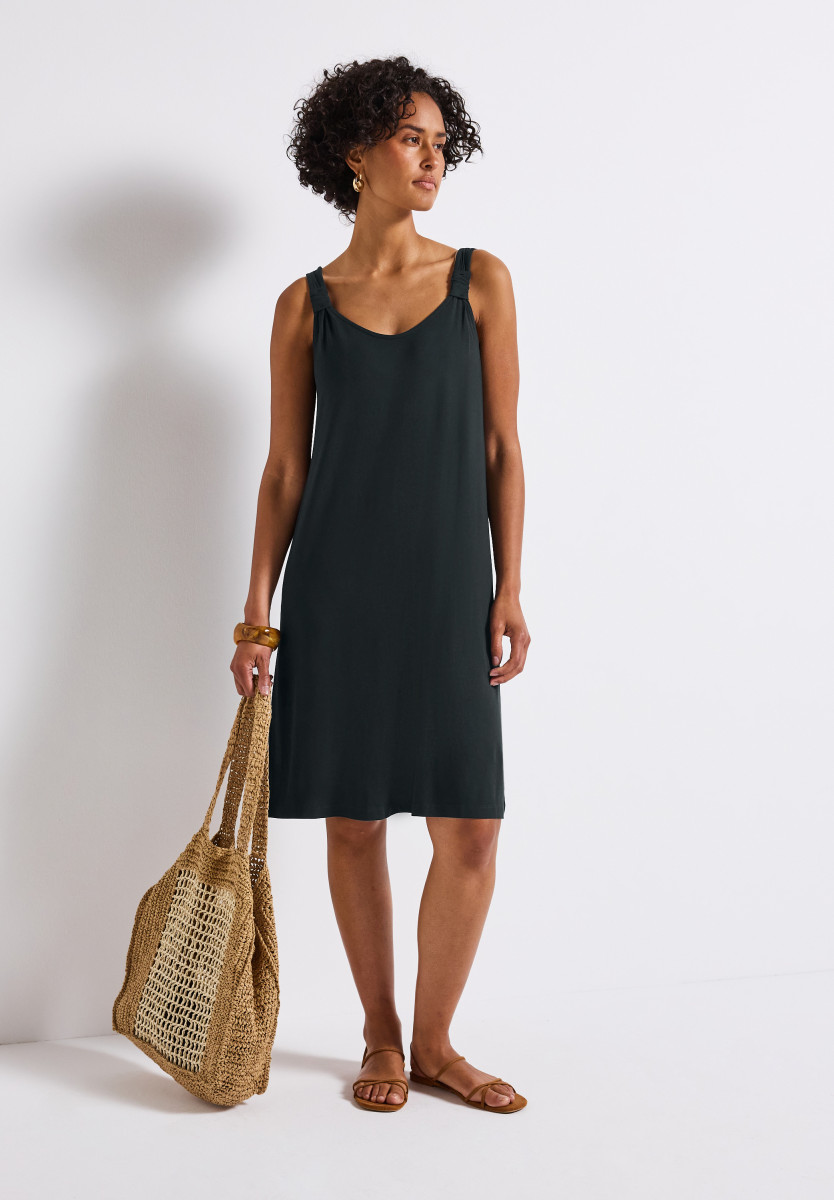 Dieses Jersey-Kleid von Street One für Damen punktet mit einem raffinierten Knotendetail an den Trägern. Der gerundete V-Ausschnitt sorgt für einen schmeichelhaften Look, während der Viskosemix mit Stretchanteil weich fällt und hohen Komfort bietet. Ideal für warme Tage. Knielanges Jersey-Kleid Gerundeter V-Ausschnitt Träger mit Knotendetail Weich fallend Viskosemix mit Stretchanteil Material: 95% Viskose, 5% Elasthan