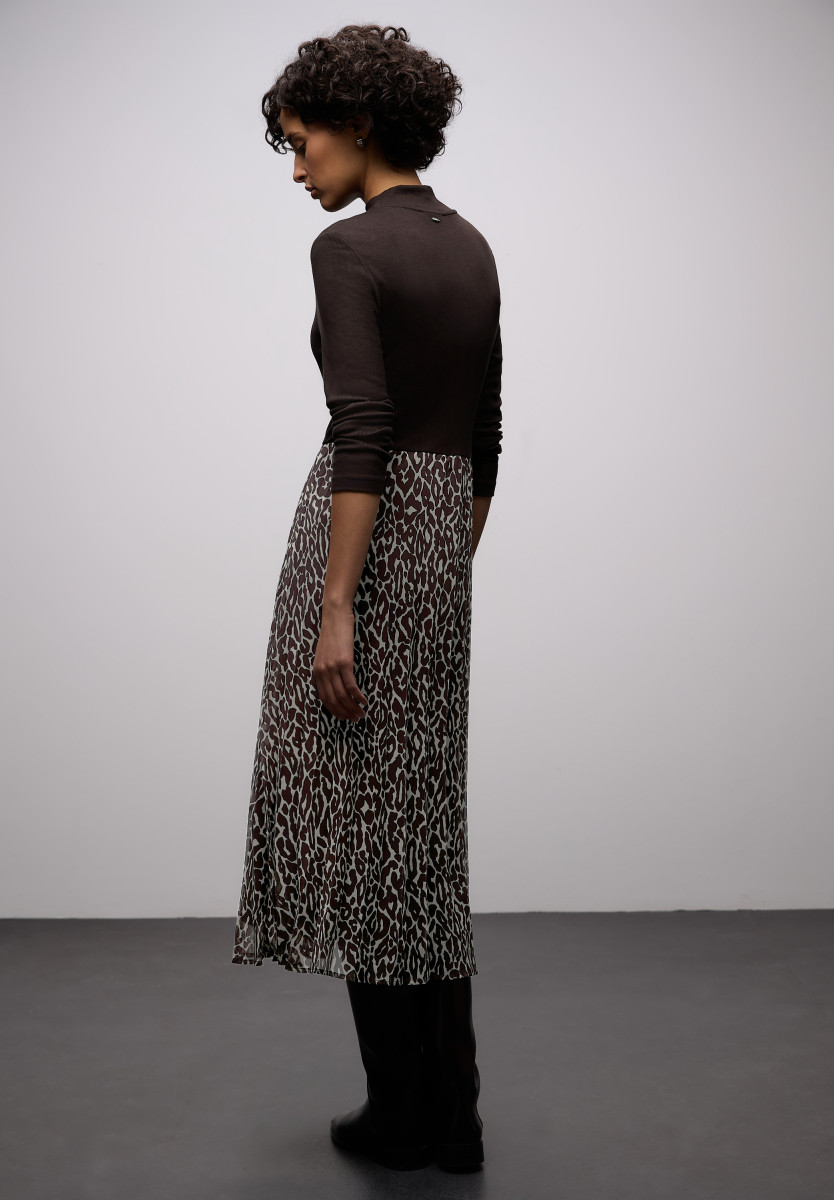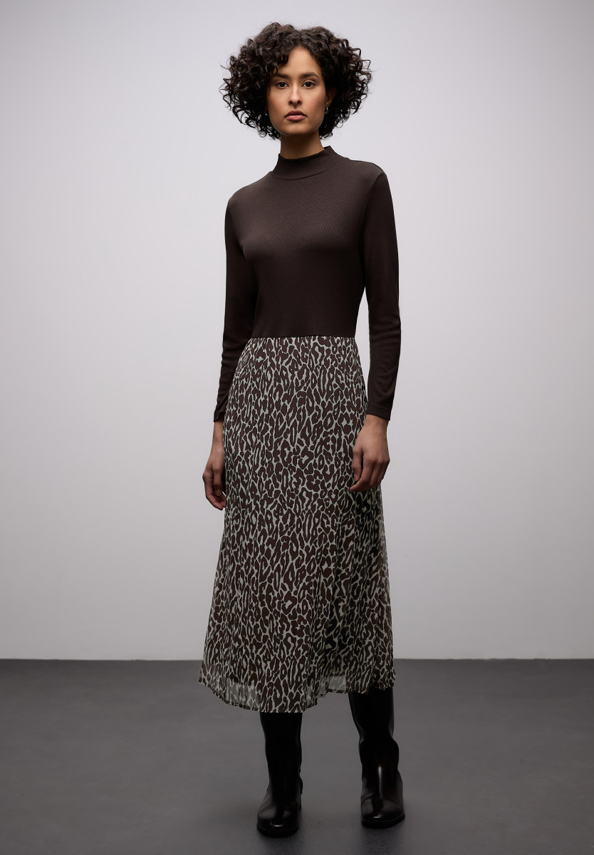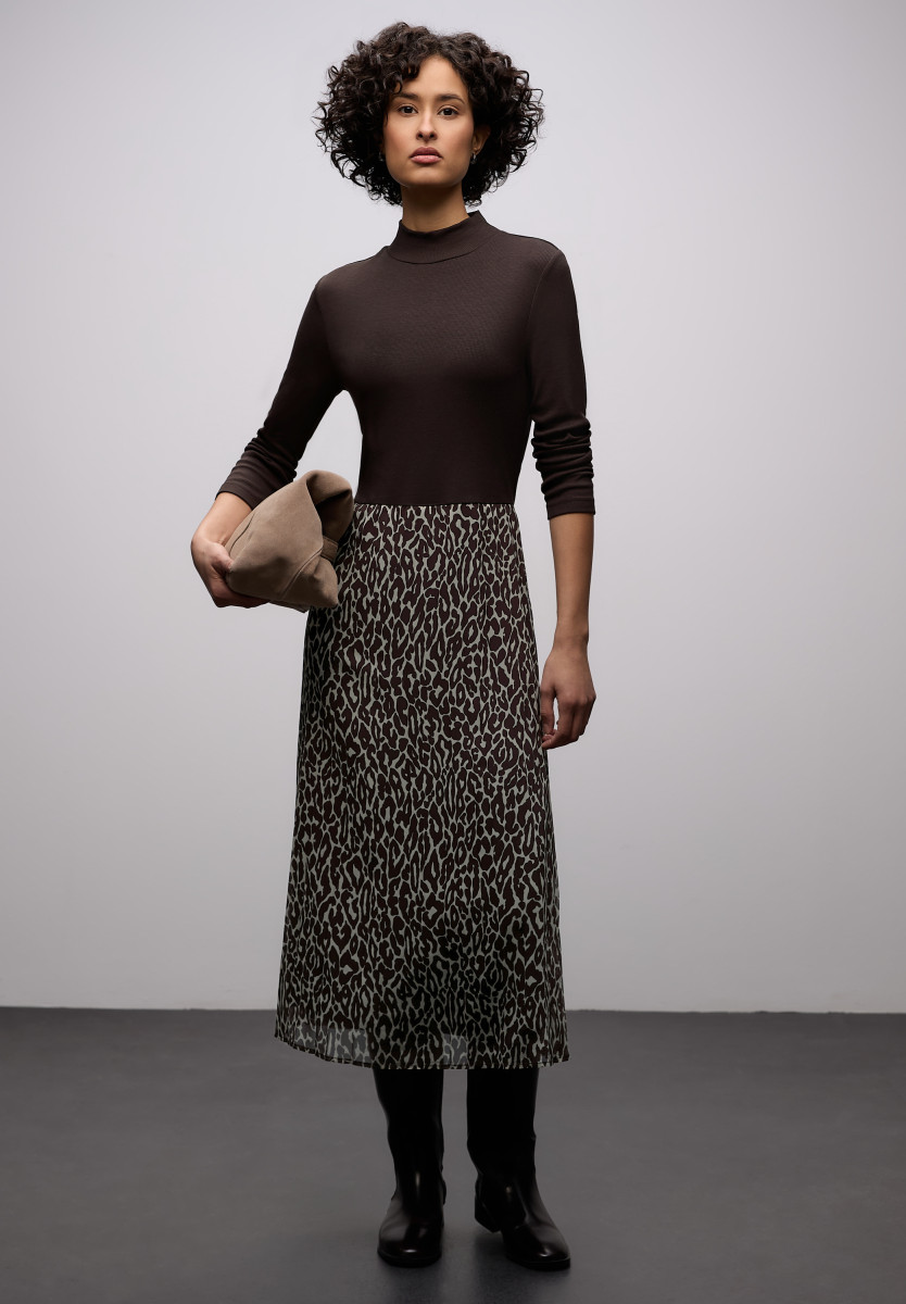 Dieses Kleid von Street One für Damen kombiniert ein fein geripptes Jersey‑Oberteil in Unifarbe mit einem femininen Plissée‑Rock im Leo‑Muster – modern und stilvoll. Das Kleid lässt sich angenehm tragen und modisch stylen. Die bequeme Passform und der auffällige Animal Print machen das Kleid zum Hingucker in deiner Garderobe.