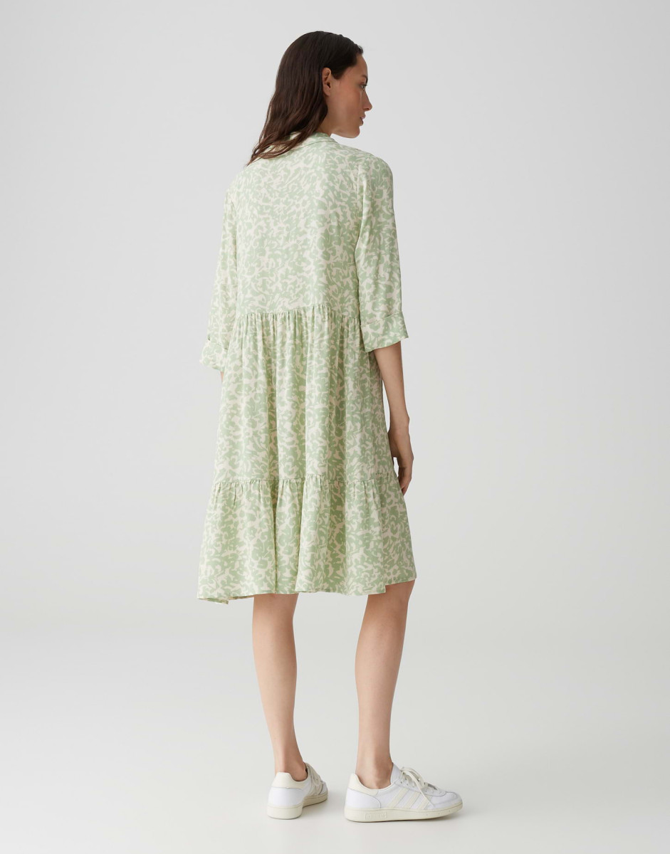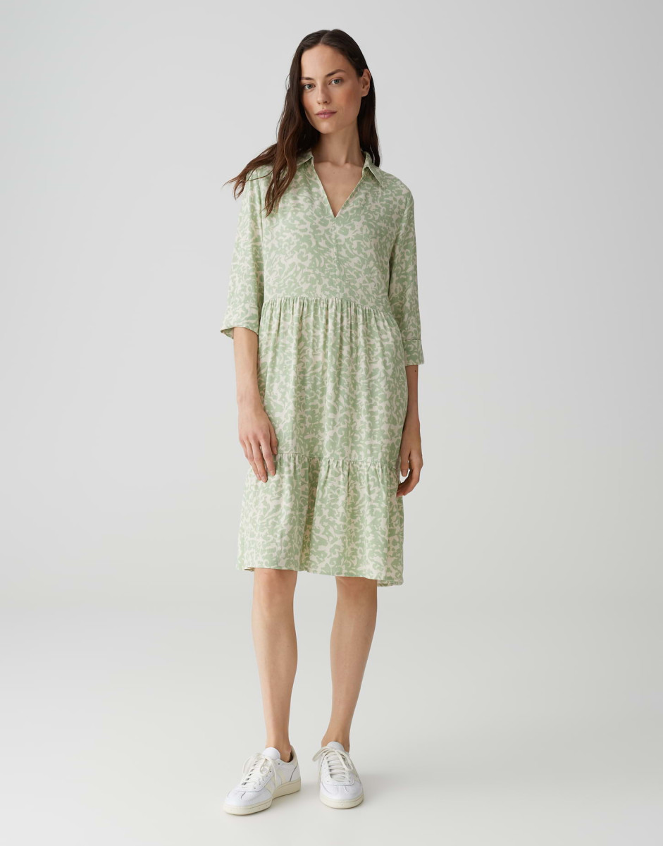 Lockere Passform | A-Linie | Knielang | 3/4 Arm | V-Ausschnitt | Umlegekragen | Rückenlänge ca. 100 cm bei Größe 36 | Model Größe 178 cm – trägt Größe 36 | Webware | Jacquard Struktur | Weicher Griff | Fließender Fall | Floraler Print | Volantstufen | Aufschlag am Ärmel