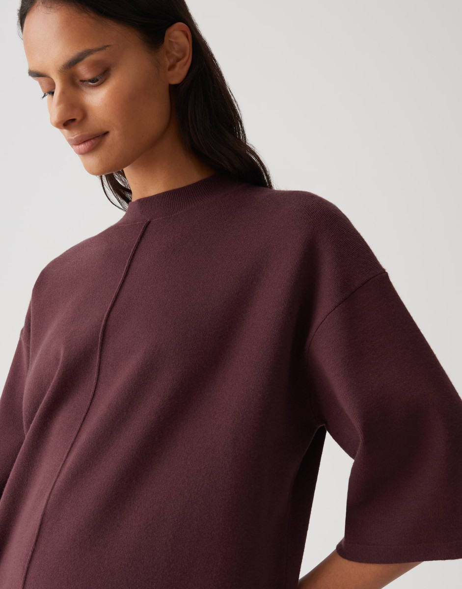 Stilvoll, bequem und vielseitig: Dieses Feinstrickkleid in Mini-Länge überzeugt mit einer lockeren Passform und einem geraden Schnitt, der sich jedem Figurtyp schmeichelhaft anpasst. Der hohe Rundhalsausschnitt und die überschnittenen Schultern mit 3/4-Ärmeln verleihen dem Look eine moderne, entspannte Note.
