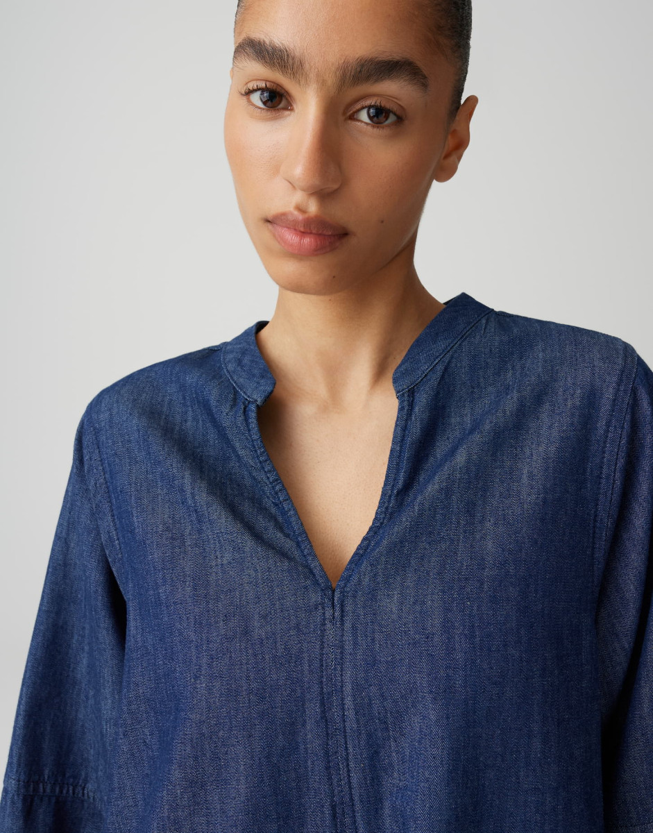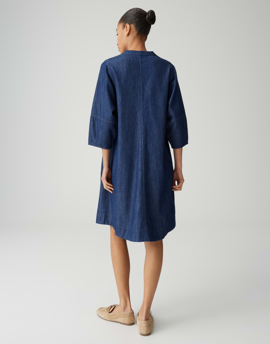 Das Wonema ist ein locker geschnittenes A-Linien-Kleid, das knapp über dem Knie endet und mit 3/4-Ärmeln sowie einem Rundhals mit V-Ausschnitt überzeugt. Die Chambray-Denim-Qualität mit Rinsed-Waschung verleiht dem Kleid einen weichen Griff und einen lässigen Charakter, während Nahttaschen und abgesteppte Teilungsnähte praktische sowie stilgebende Akzente setzen. Ballonärmel und eine zurückhaltende Rückenpartie machen das Modell besonders vielseitig und alltagstauglich.Lief.-Art-Nr: 10551013341423