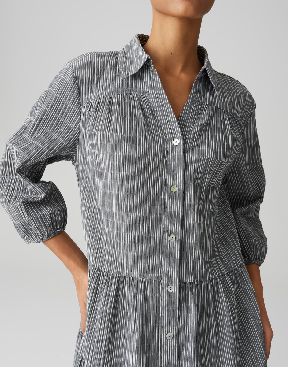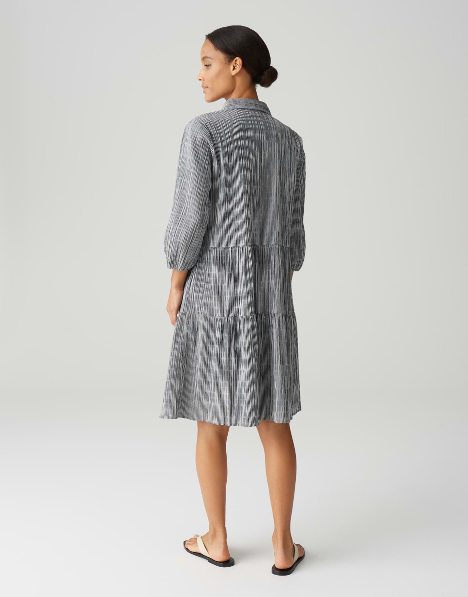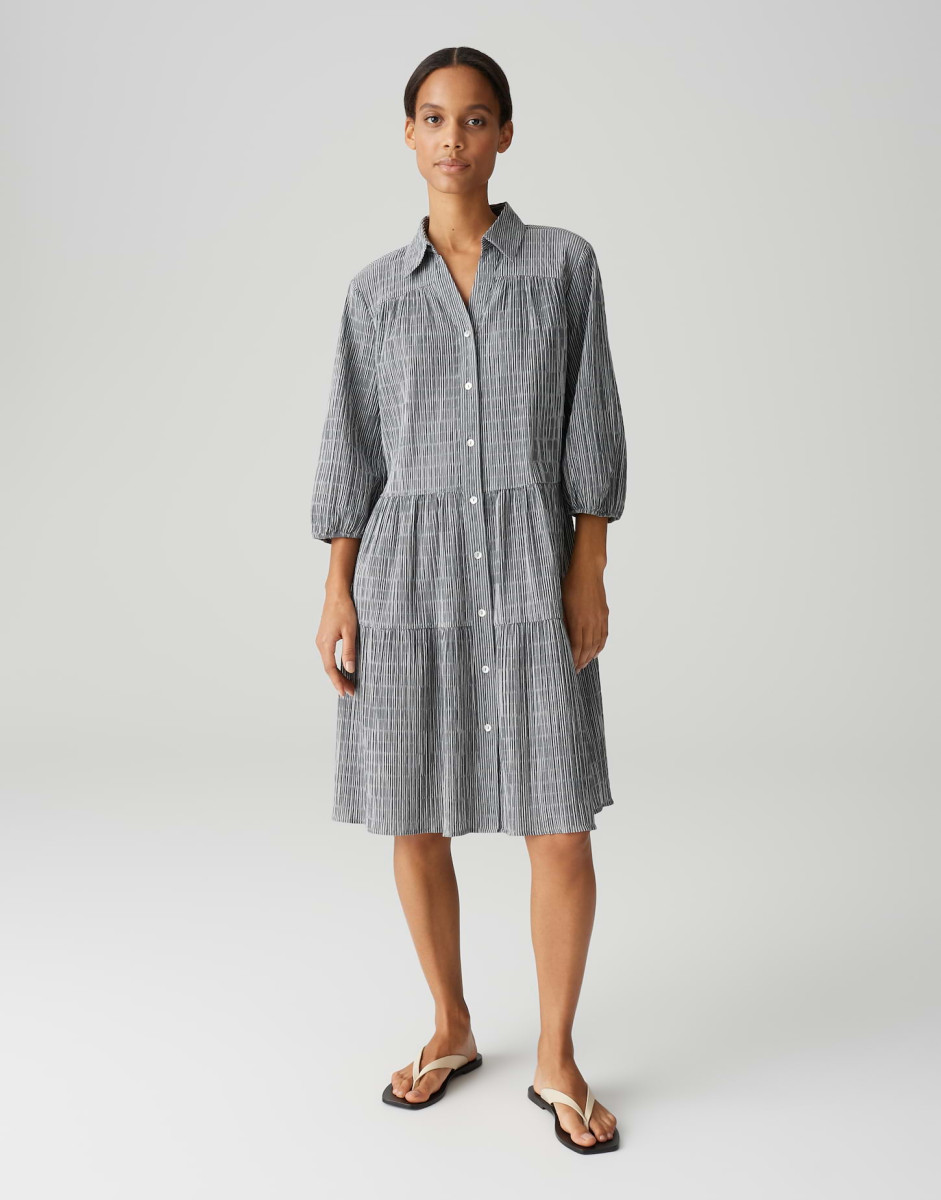 Weite Passform | A-Linie | Knielang | 3/4 Arm | V-Ausschnitt | Hemdblusenkragen | Rückenlänge ca. 99 cm bei Größe 36 | Model Größe 174 cm – trägt Größe 36 | Webware | Enthält nichttextile Teile tierischen Ursprungs | Gesmokt | Weicher Griff | Weich fließender Fall | Ultra elastischer Stoff | Gestreift | Lange Knopfleiste | Perlmuttknöpfe | Ballonärmel | Volant mit Kräuselung.