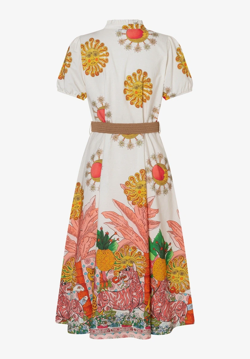 Hemdblusenkleid | Durchgehende Knopfleiste | Kleiner Stehkragen | Kurze Puffärmel | Taillengürtel aus Bast wird mitgeliefert | Ungefüttert