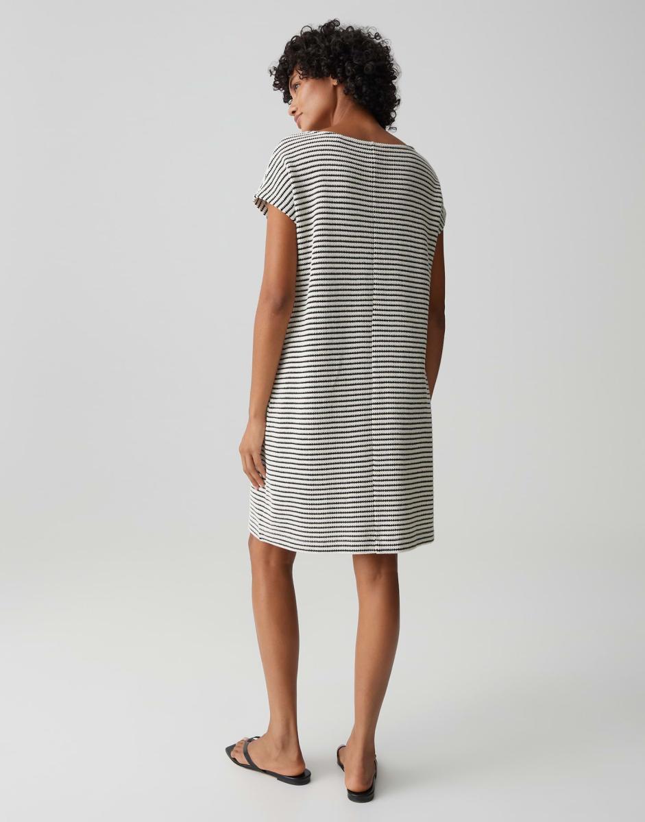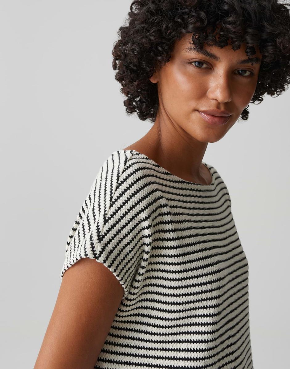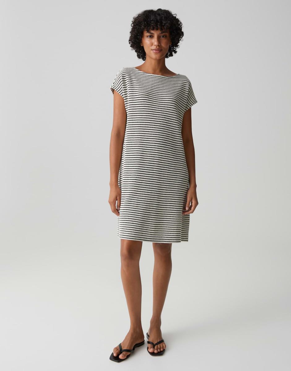 lockere Passform, gerader Schnitt, knielang, überschnittene Schulter mit Kurzarm, U-Boot-Ausschnitt, Rückenlänge ca. 92 cm bei Größe 36, Model Größe 174 cm – trägt Größe 36, Strick, weicher Griff, weich fließender Fall, gestreift, Eingrifftaschen in den Seiten, Teilungsnaht im Rücken
