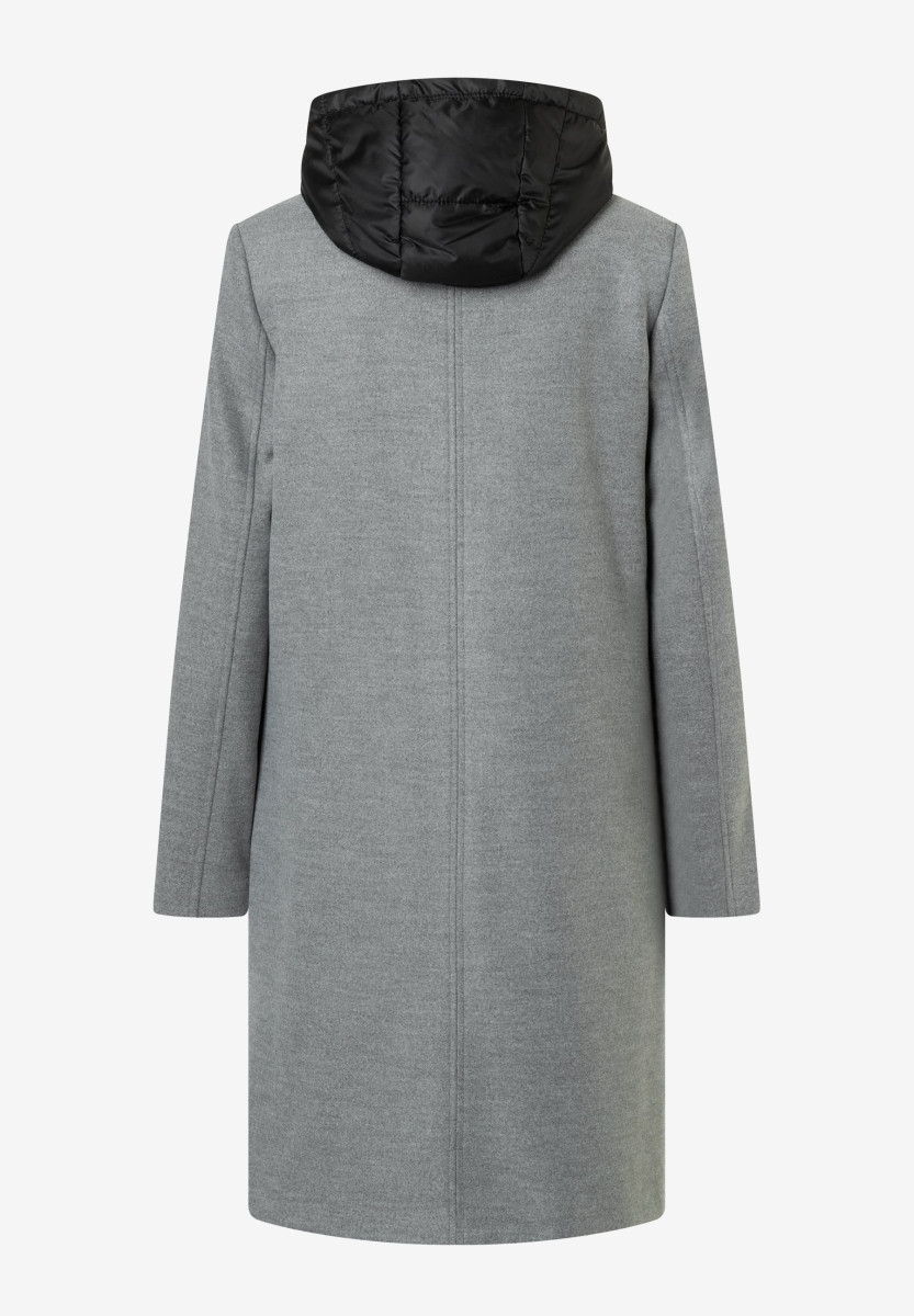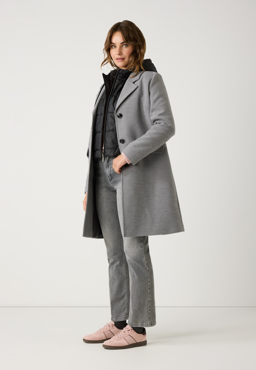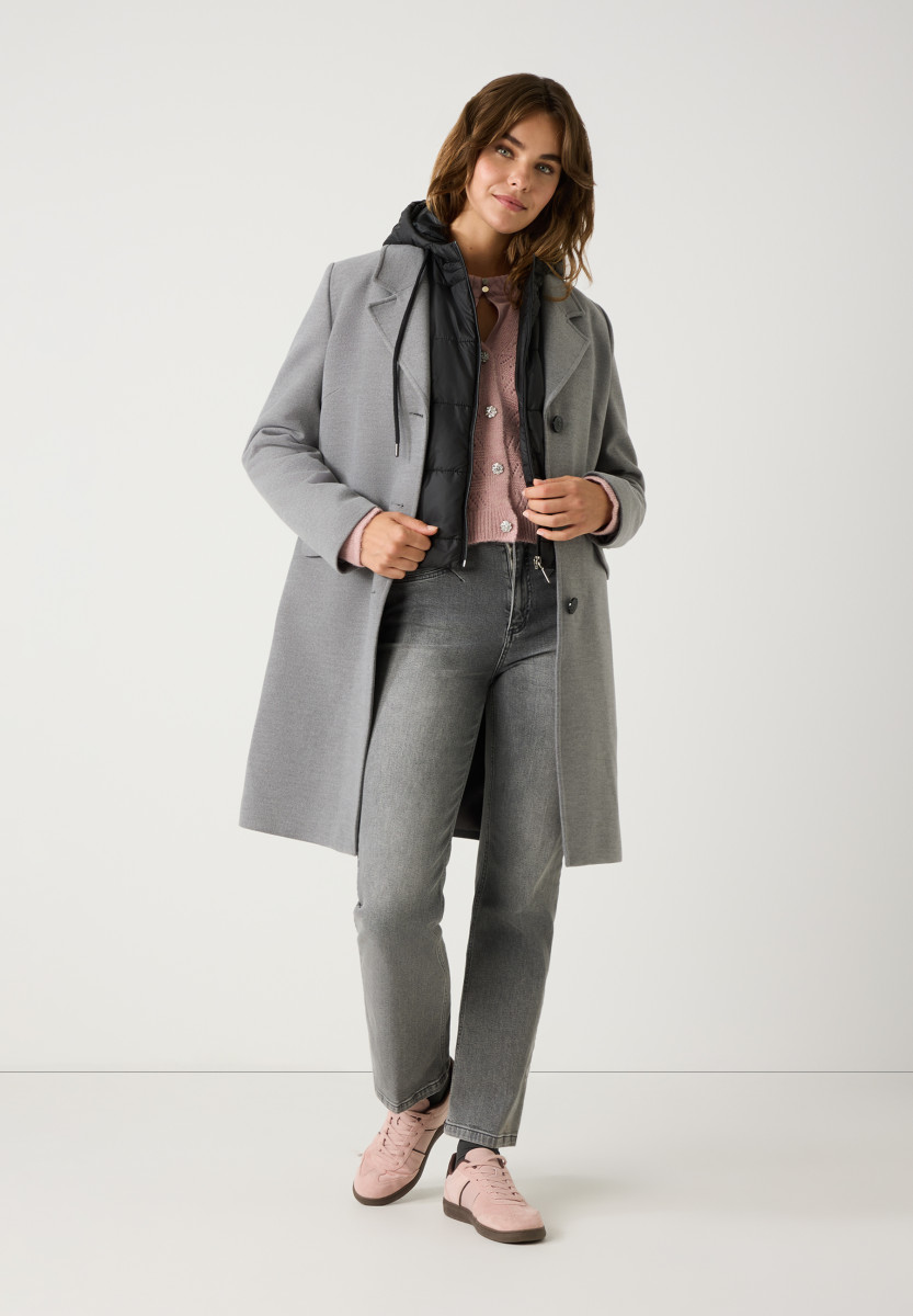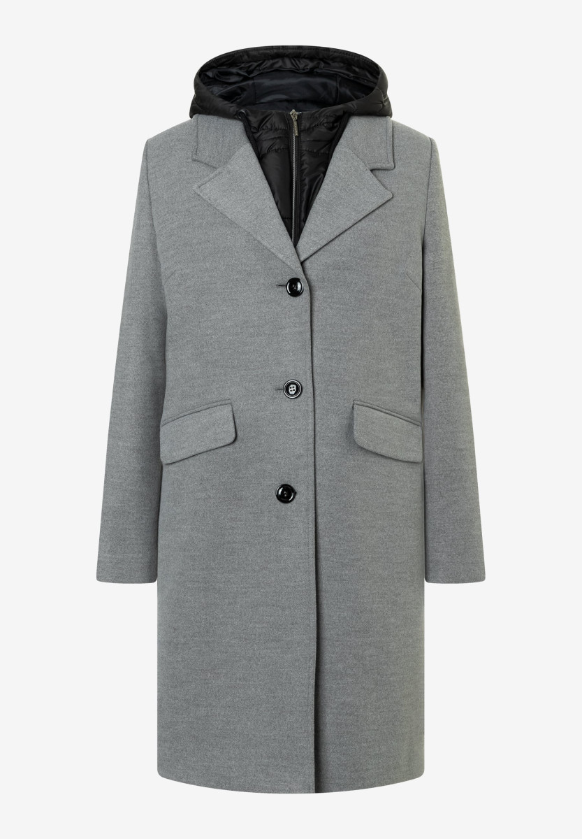 Der lässige Blazermantel von MORE & MORE ist schick und sportiv zugleich. Er bietet ein besonderes Feature: eine ausknöpfbare, wattierte Steppweste mit Kapuze und Reißverschluss, welche kuschelig warm hält und auch einzeln getragen werden kann.