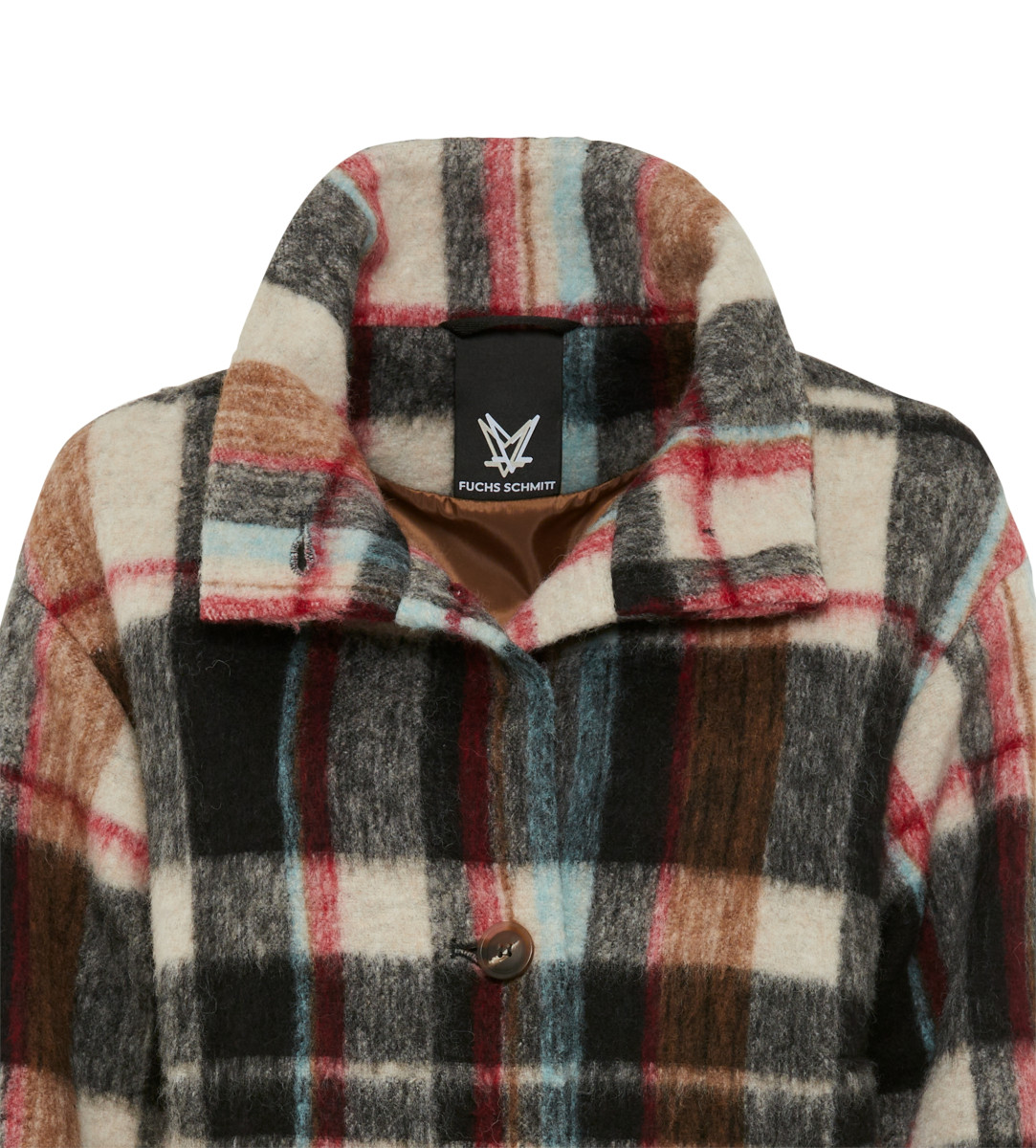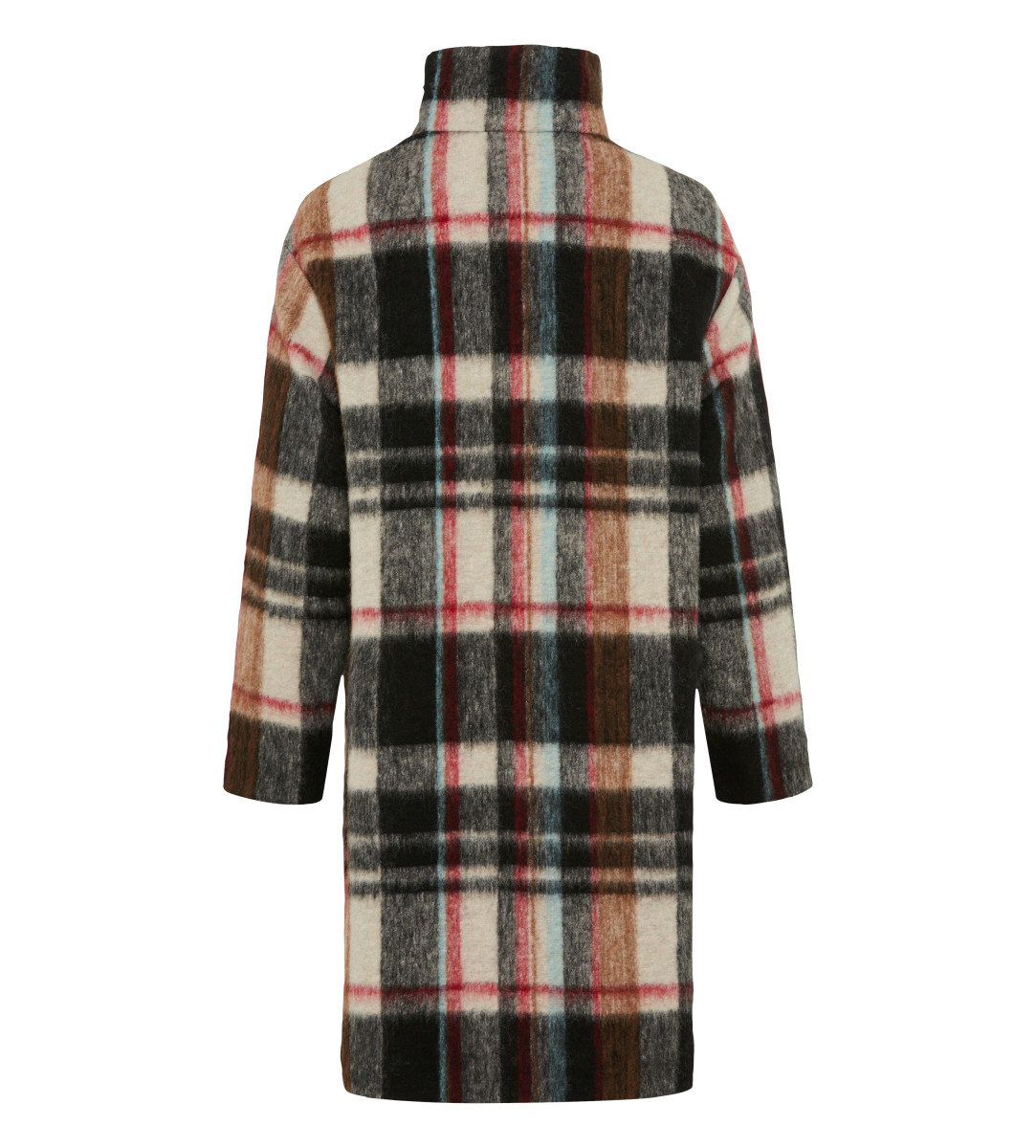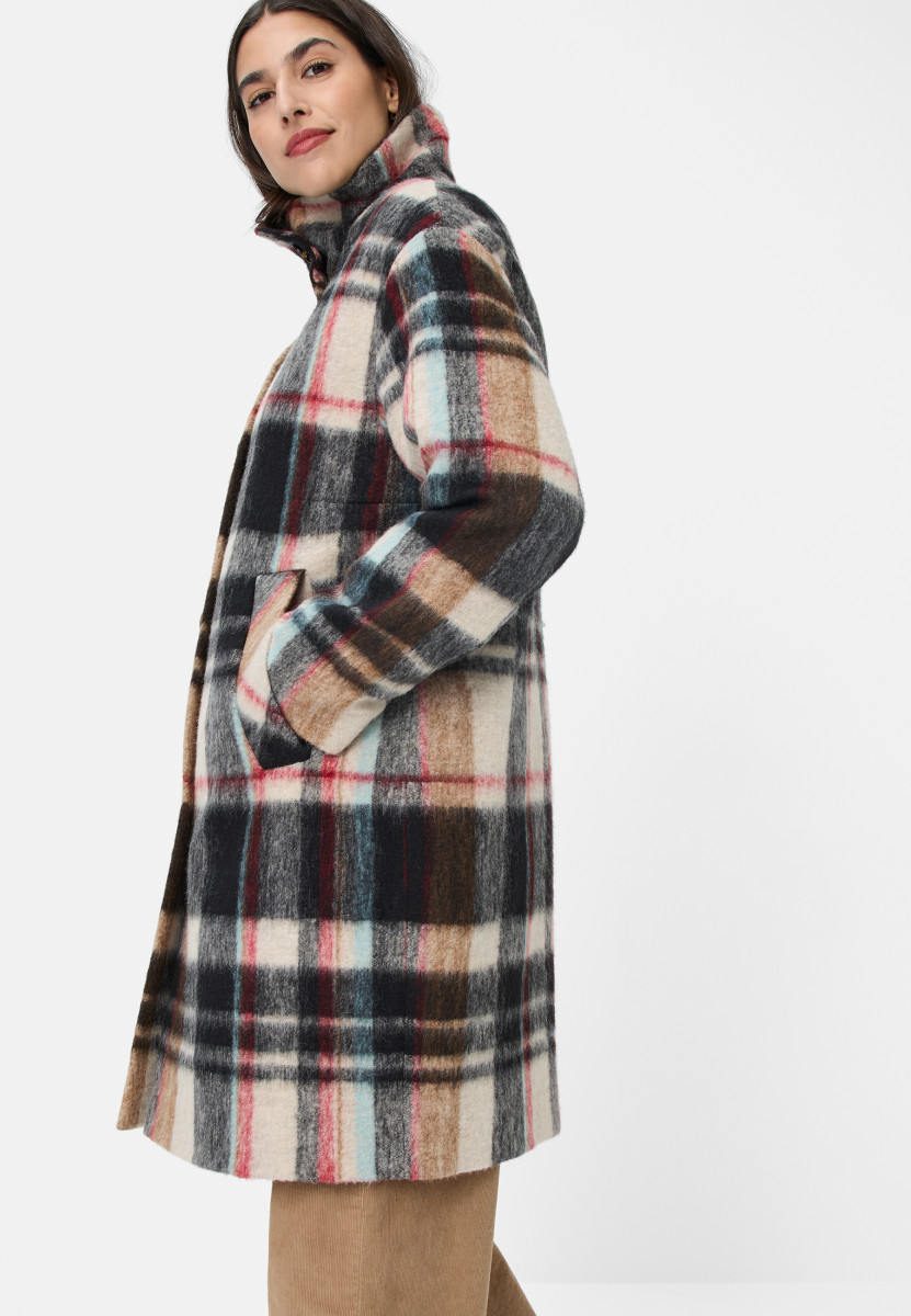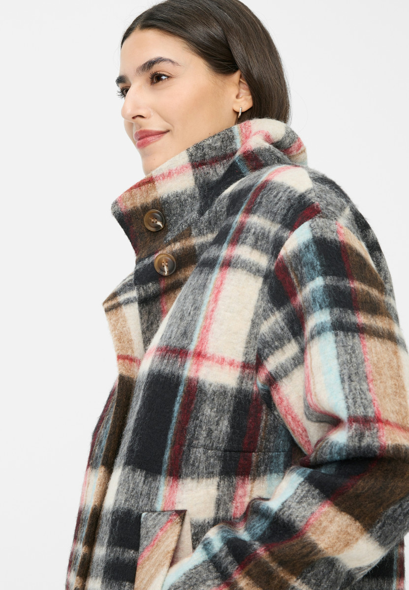 Dieser elegante Wollmantel mit auffälligem Karomuster in kräftigen Farben ist der perfekte Begleiter für die kühleren Monate. Der hohe Stehkragen bietet zusätzlichen Schutz vor der Kälte, während die schlichte Knopfleiste und die praktischen Taschen für Funktionalität sorgen. Ein Must-have für Frauen, die Stil und Komfort gleichermaßen schätzen.